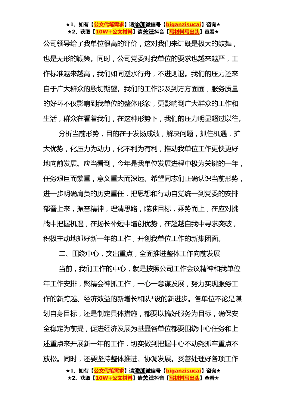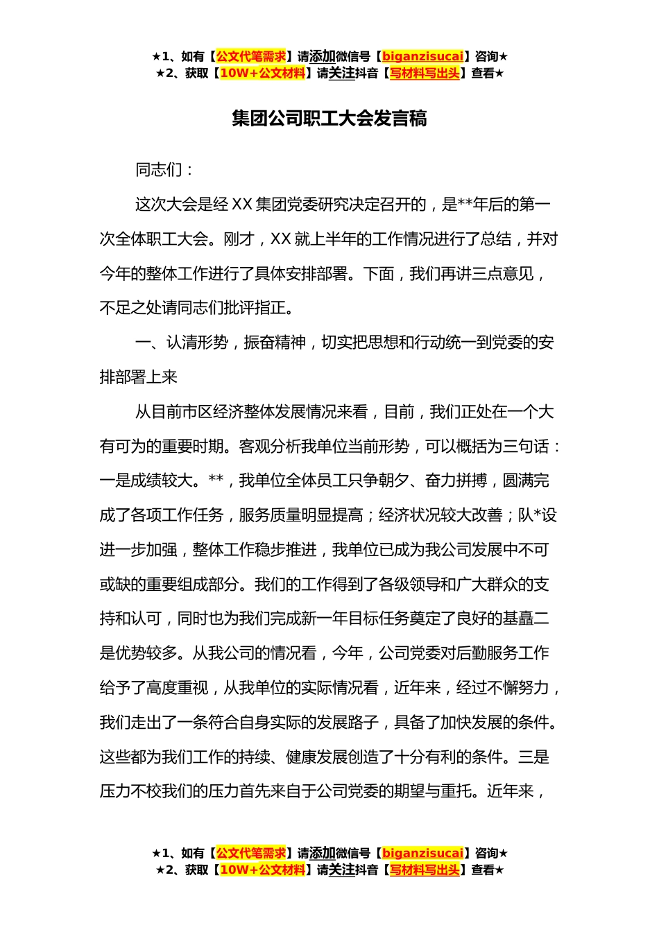 ★1、如有【公文代笔需求】请添加微信号【biganzisucai】咨询★★2、获取【10W+公文材料】请关注抖音【写材料写出头】查看★集团公司职工大会发言稿同志们:这次大会是经XX集团党委研究决定召开的,是**年后的第一次全体职工大会。刚才,XX就上半年的工作情况进行了总结,并对今年的整体工作进行了具体安排部署。下面,我们再讲三点意见,不足之处请同志们批评指正。一、认清形势,振奋精神,切实把思想和行动统一到党委的安排部署上来从目前市区经济整体发展情况来看,目前,我们正处在一个大有可为的重要时期。客观分析我单位当前形势,可以概括为三句话:一是成绩较大。**,我单位全体员工只争朝夕、奋力拼搏,圆满完成了各项工作任务,服务质量明显提高;经济状况较大改善;队*设进一步加强,整体工作稳步推进...