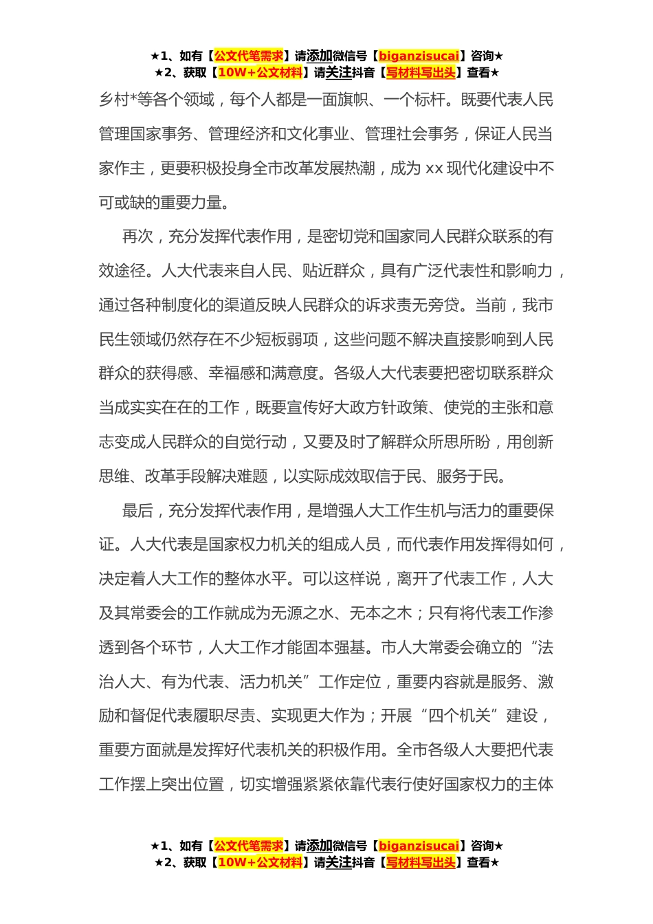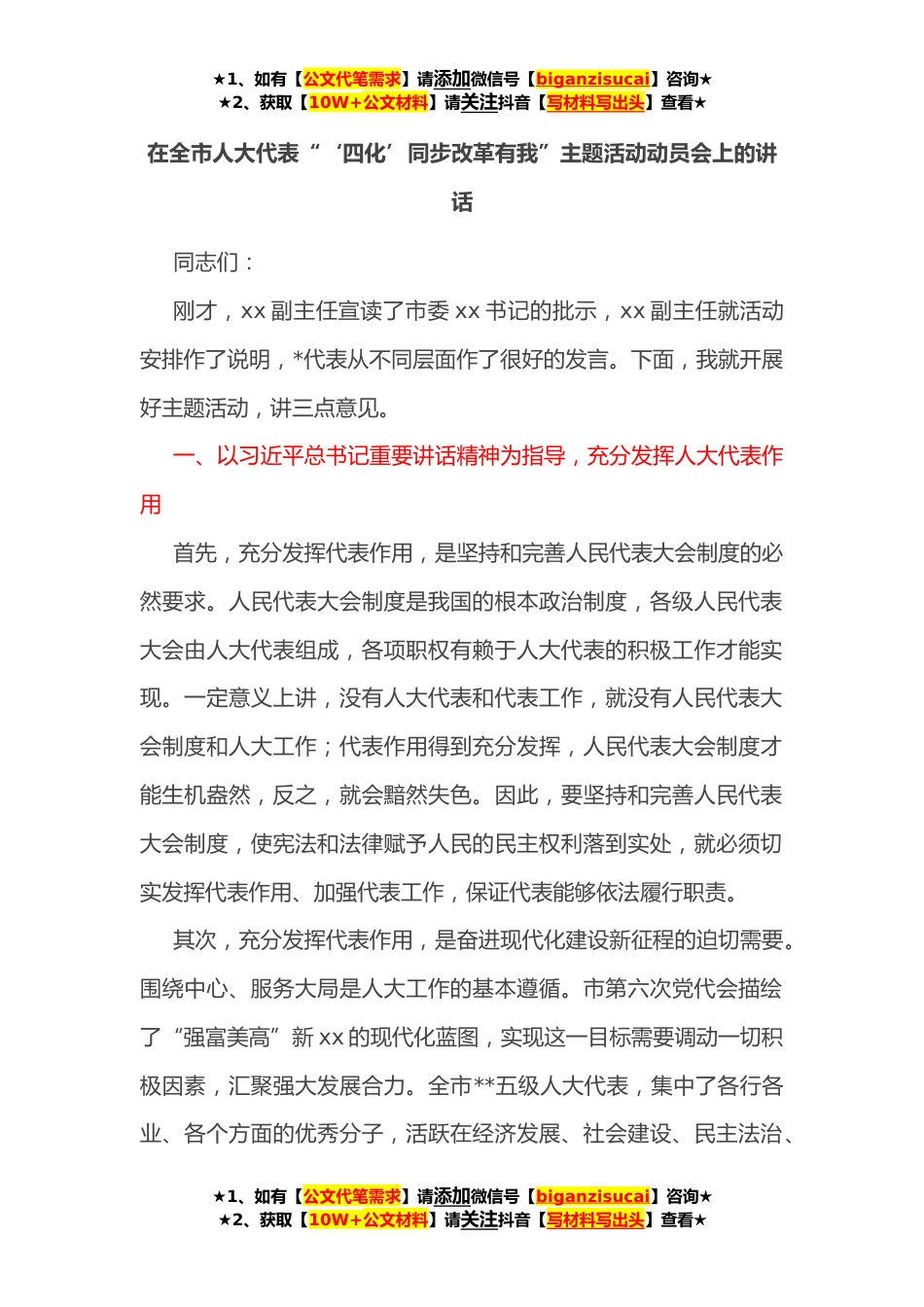 ★1、如有【公文代笔需求】请添加微信号【biganzisucai】咨询★★2、获取【10W+公文材料】请关注抖音【写材料写出头】查看★在全市人大代表“‘四化’同步改革有我”主题活动动员会上的讲话同志们:刚才,xx副主任宣读了市委xx书记的批示,xx副主任就活动安排作了说明,*代表从不同层面作了很好的发言。下面,我就开展好主题活动,讲三点意见。一、以习近平总书记重要讲话精神为指导,充分发挥人大代表作用首先,充分发挥代表作用,是坚持和完善人民代表大会制度的必然要求。人民代表大会制度是我国的根本政治制度,各级人民代表大会由人大代表组成,各项职权有赖于人大代表的积极工作才能实现。一定意义上讲,没有人大代表和代表工作,就没有人民代表大会制度和人大工作;代表作用得到充分发挥,人民代表大会制度...