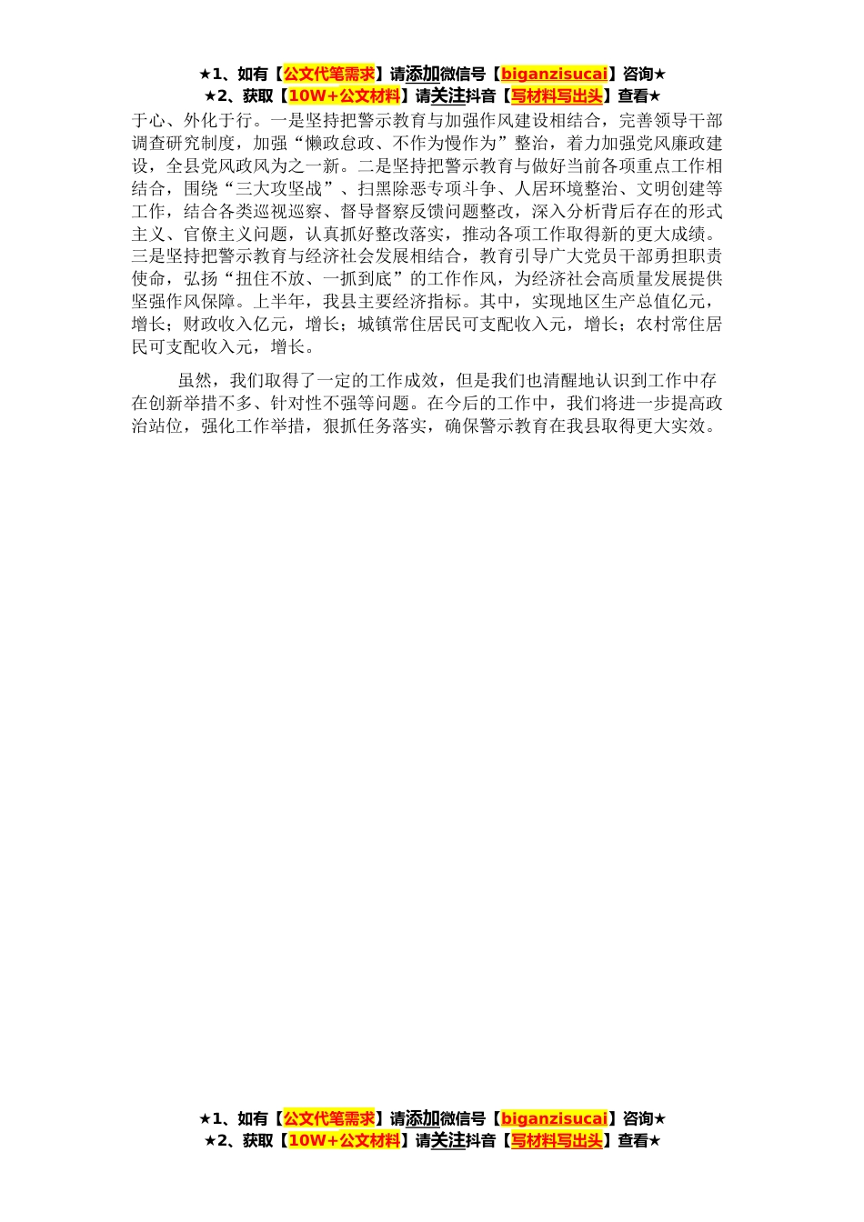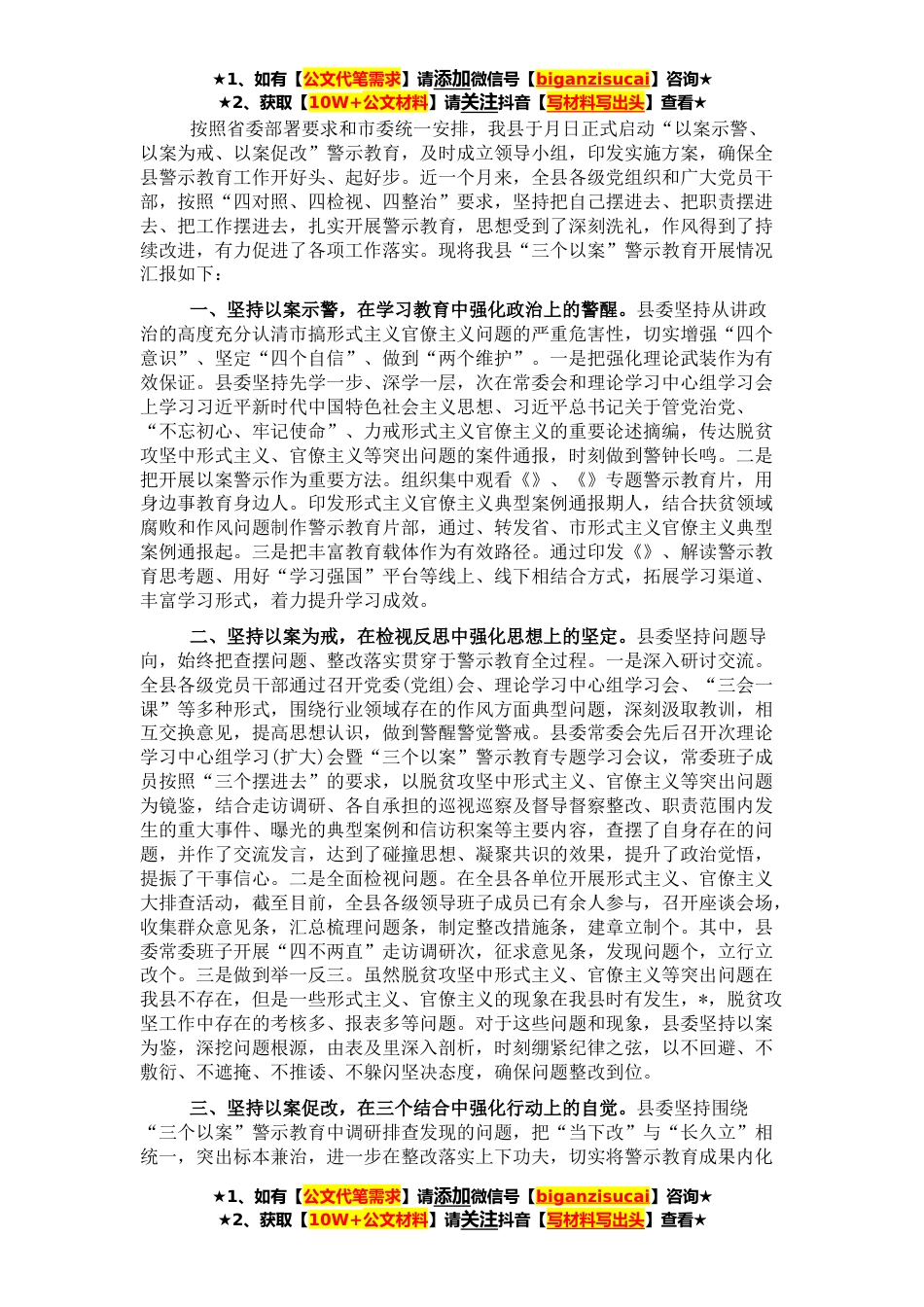 ★1、如有【公文代笔需求】请添加微信号【biganzisucai】咨询★★2、获取【10W+公文材料】请关注抖音【写材料写出头】查看★按照省委部署要求和市委统一安排,我县于月日正式启动“以案示警、以案为戒、以案促改”警示教育,及时成立领导小组,印发实施方案,确保全县警示教育工作开好头、起好步。近一个月来,全县各级党组织和广大党员干部,按照“四对照、四检视、四整治”要求,坚持把自己摆进去、把职责摆进去、把工作摆进去,扎实开展警示教育,思想受到了深刻洗礼,作风得到了持续改进,有力促进了各项工作落实。现将我县“三个以案”警示教育开展情况汇报如下:一、坚持以案示警,在学习教育中强化政治上的警醒。县委坚持从讲政治的高度充分认清市搞形式主义官僚主义问题的严重危害性,切实增强“四个意识...