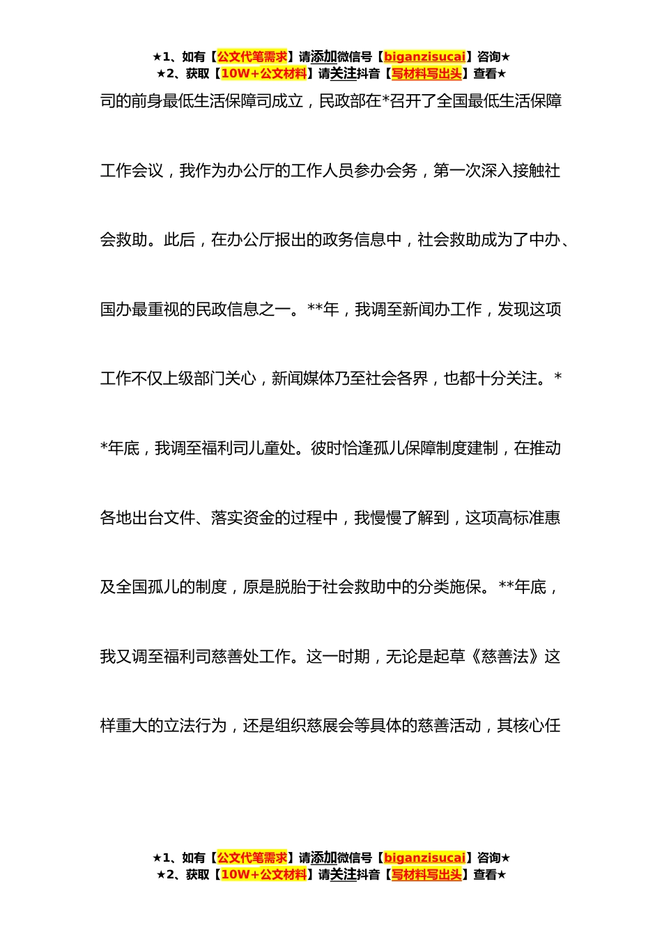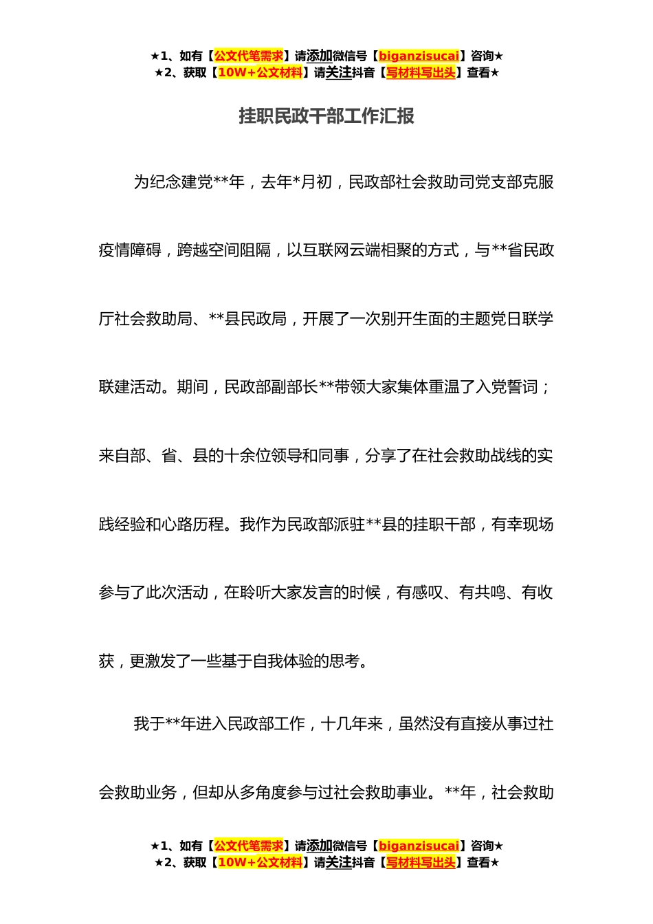 ★1、如有【公文代笔需求】请添加微信号【biganzisucai】咨询★★2、获取【10W+公文材料】请关注抖音【写材料写出头】查看★挂职民政干部工作汇报为纪念建党**年,去年*月初,民政部社会救助司党支部克服疫情障碍,跨越空间阻隔,以互联网云端相聚的方式,与**省民政厅社会救助局、**县民政局,开展了一次别开生面的主题党日联学联建活动。期间,民政部副部长**带领大家集体重温了入党誓词;来自部、省、县的十余位领导和同事,分享了在社会救助战线的实践经验和心路历程。我作为民政部派驻**县的挂职干部,有幸现场参与了此次活动,在聆听大家发言的时候,有感叹、有共鸣、有收获,更激发了一些基于自我体验的思考。我于**年进入民政部工作,十几年来,虽然没有直接从事过社会救助业务,但却从多角度参与过社会救...