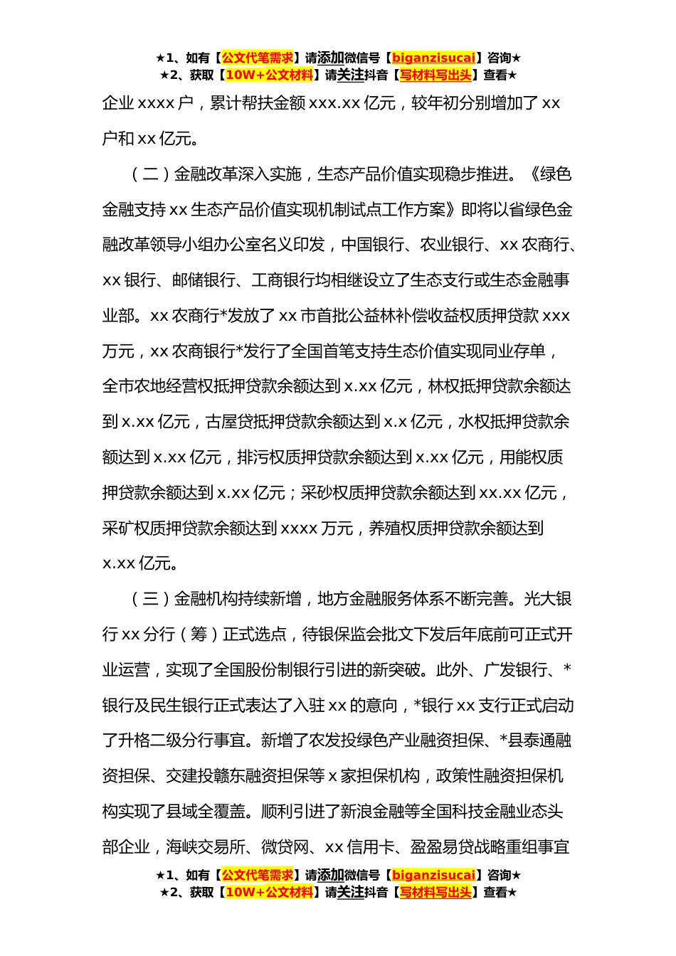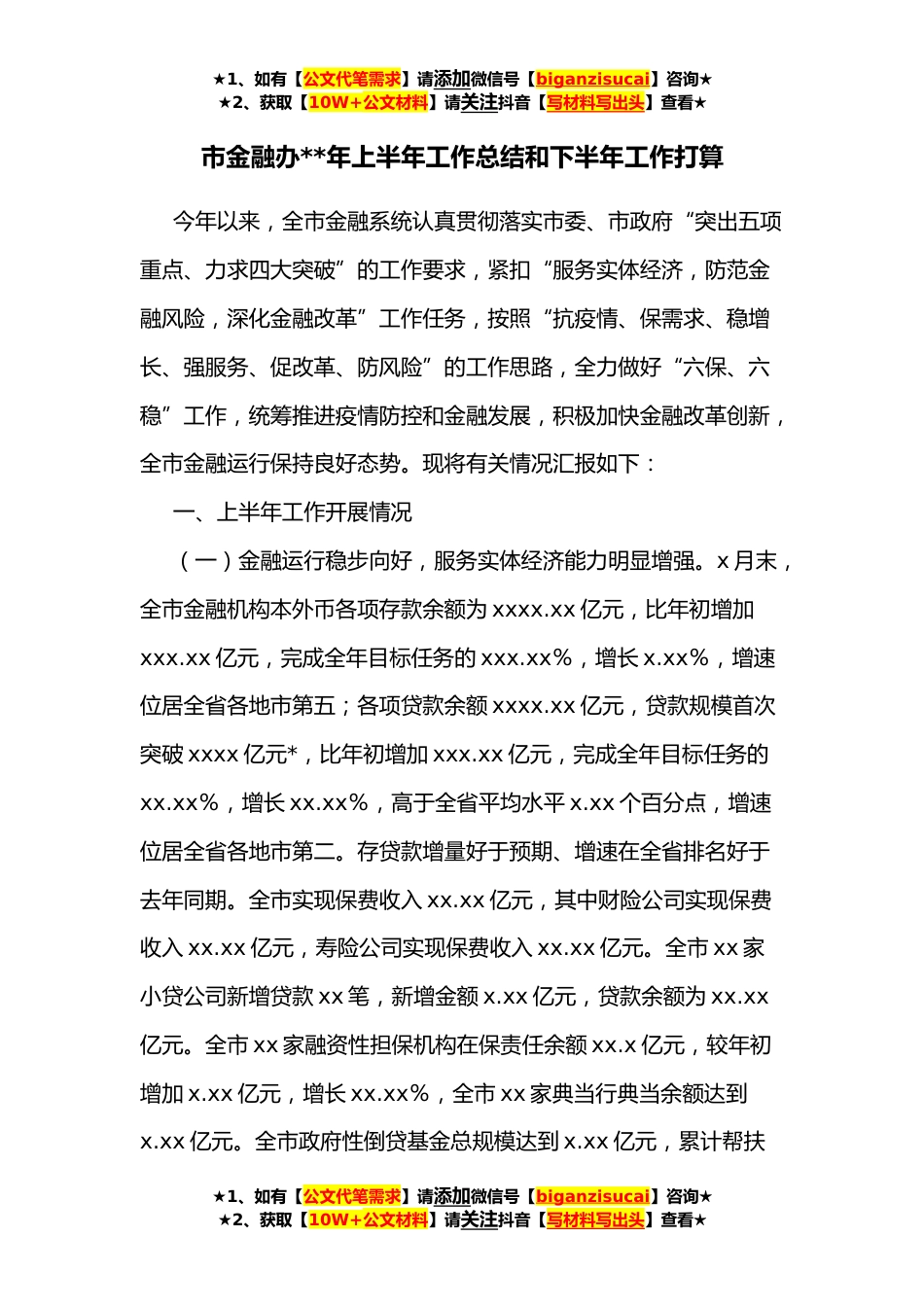 ★1、如有【公文代笔需求】请添加微信号【biganzisucai】咨询★★2、获取【10W+公文材料】请关注抖音【写材料写出头】查看★市金融办**年上半年工作总结和下半年工作打算今年以来,全市金融系统认真贯彻落实市委、市政府“突出五项重点、力求四大突破”的工作要求,紧扣“服务实体经济,防范金融风险,深化金融改革”工作任务,按照“抗疫情、保需求、稳增长、强服务、促改革、防风险”的工作思路,全力做好“六保、六稳”工作,统筹推进疫情防控和金融发展,积极加快金融改革创新,全市金融运行保持良好态势。现将有关情况汇报如下:一、上半年工作开展情况(一)金融运行稳步向好,服务实体经济能力明显增强。x月末,全市金融机构本外币各项存款余额为xxxx.xx亿元,比年初增加xxx.xx亿元,完成全年目标任务的xxx...