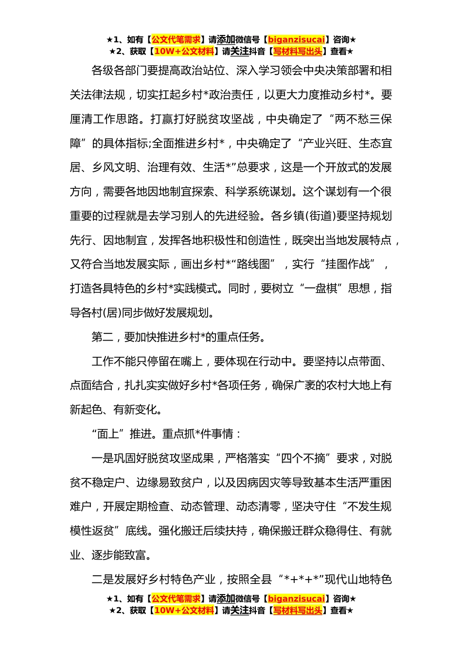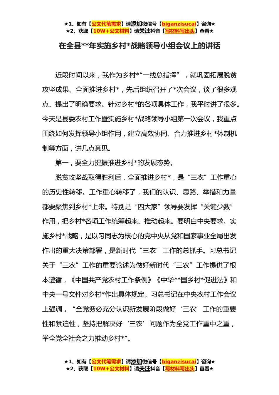 ★1、如有【公文代笔需求】请添加微信号【biganzisucai】咨询★★2、获取【10W+公文材料】请关注抖音【写材料写出头】查看★在全县**年实施乡村*战略领导小组会议上的讲话近段时间以来,我作为乡村*“一线总指挥”,就巩固拓展脱贫攻坚成果、全面推进乡村*,先后组织召开了*次会议,谈了很多观点、提出了明确要求。针对乡村*的各项具体工作,我平时讲了很多。今天是县委农村工作暨实施乡村*战略领导小组第一次会议,我重点围绕如何发挥领导小组作用,建立高效协同、合力推进乡村*体制机制等方面,讲几点意见。第一,要全力提振推进乡村*的发展态势。脱贫攻坚战取得胜利后,全面推进乡村*,是“三农”工作重心的历史性转移。工作重心转移了,我们的认识、思路、举措和力量都要聚焦到乡村*上来。特别是“四大家”领...