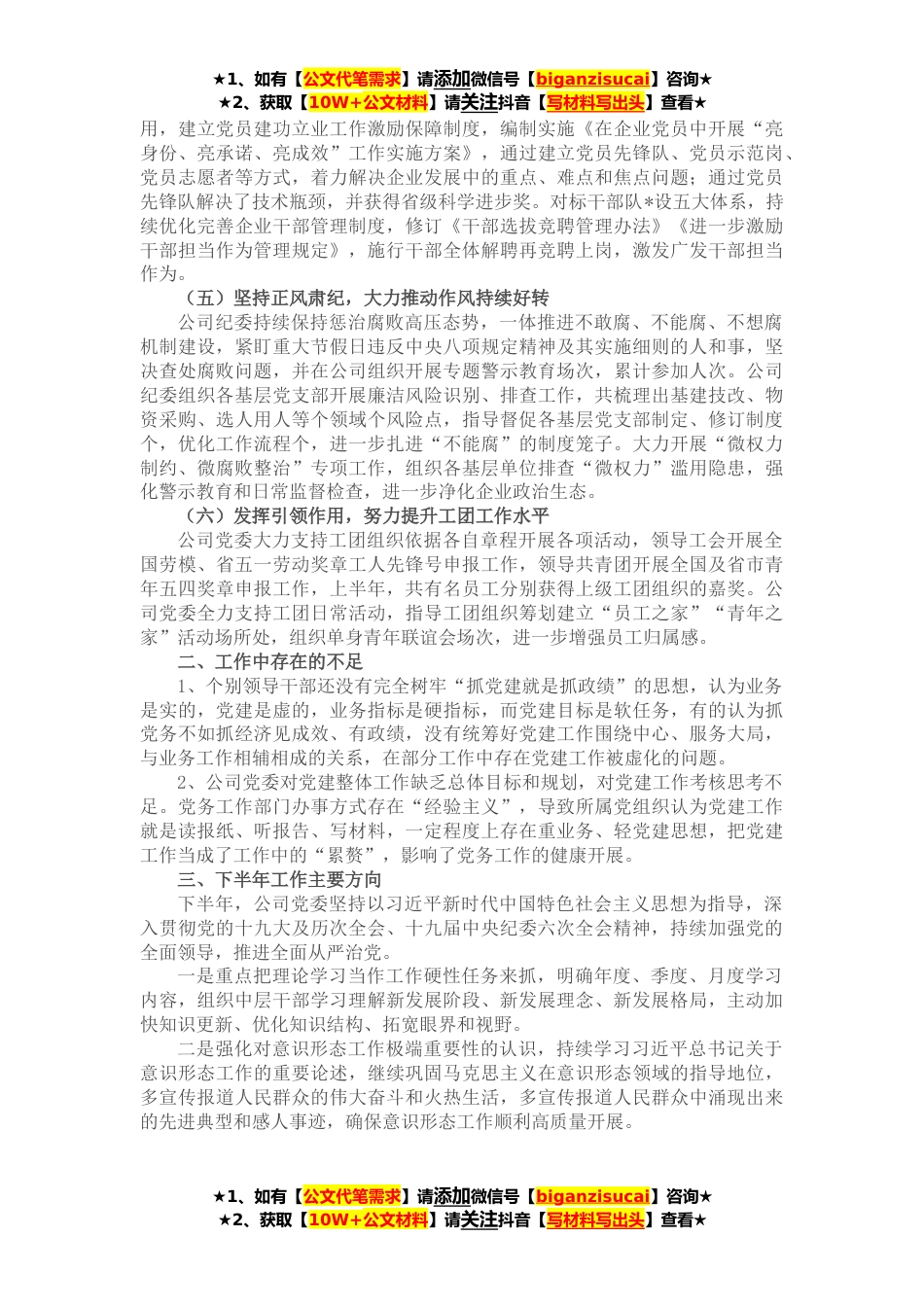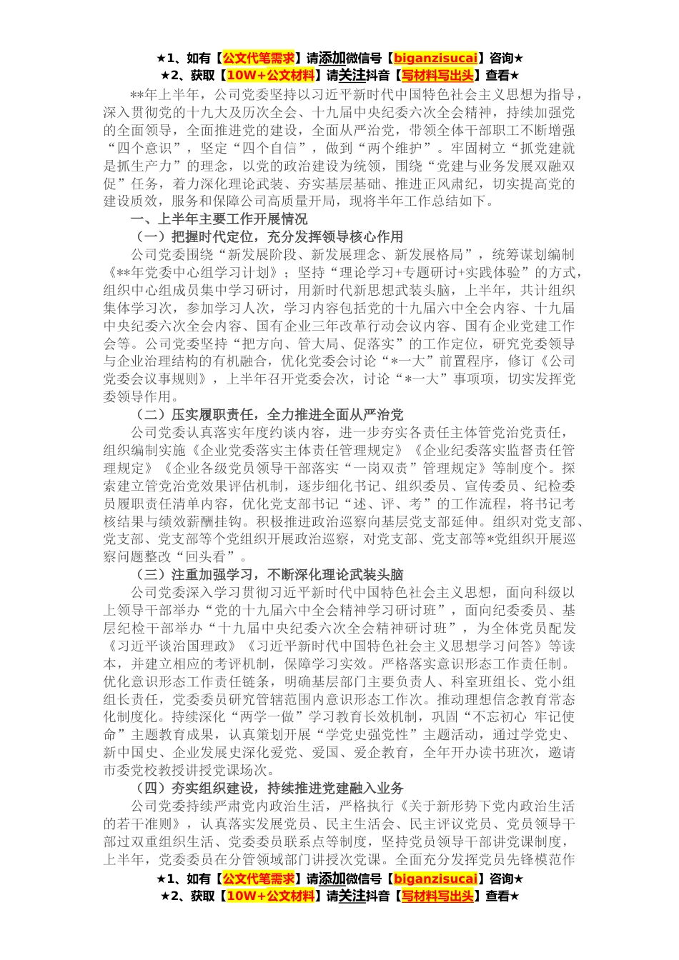 ★1、如有【公文代笔需求】请添加微信号【biganzisucai】咨询★★2、获取【10W+公文材料】请关注抖音【写材料写出头】查看★**年上半年,公司党委坚持以习近平新时代中国特色社会主义思想为指导,深入贯彻党的十九大及历次全会、十九届中央纪委六次全会精神,持续加强党的全面领导,全面推进党的建设,全面从严治党,带领全体干部职工不断增强“四个意识”,坚定“四个自信”,做到“两个维护”。牢固树立“抓党建就是抓生产力”的理念,以党的政治建设为统领,围绕“党建与业务发展双融双促”任务,着力深化理论武装、夯实基层基础、推进正风肃纪,切实提高党的建设质效,服务和保障公司高质量开局,现将半年工作总结如下。一、上半年主要工作开展情况(一)把握时代定位,充分发挥领导核心作用公司党委围绕“新...