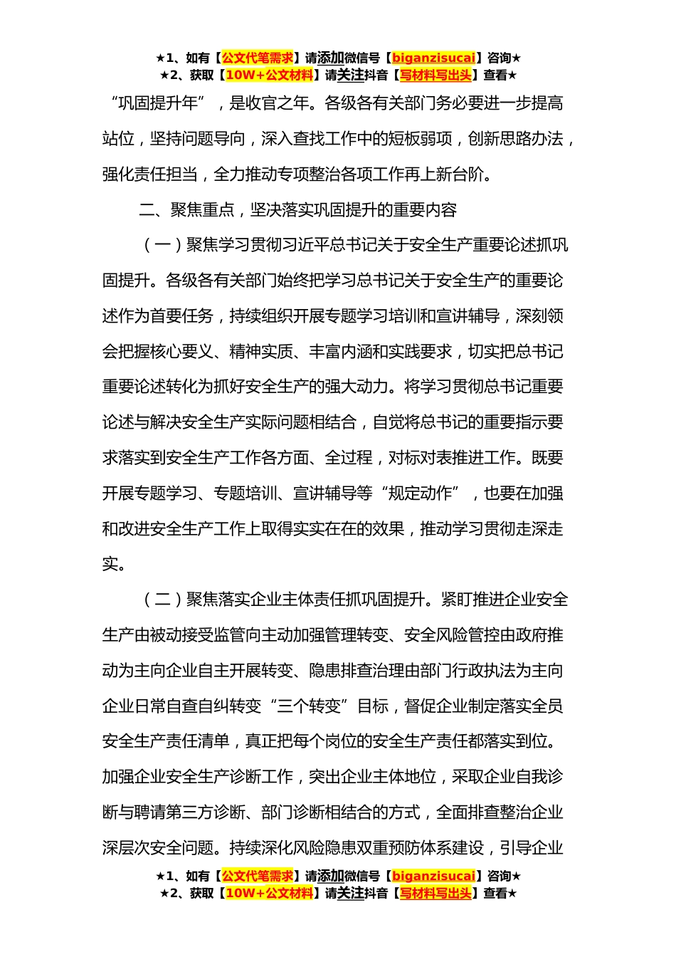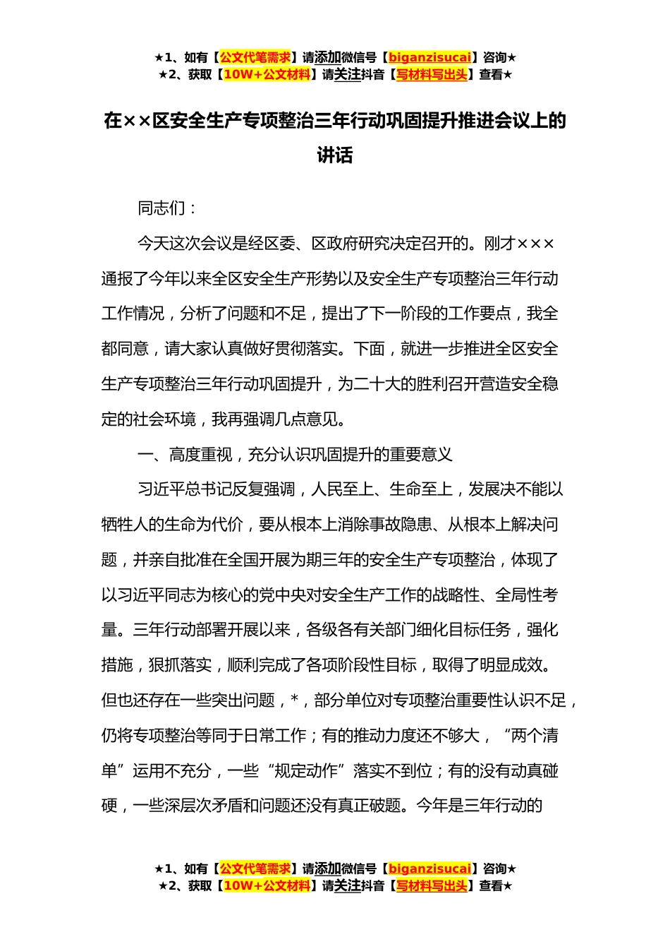 ★1、如有【公文代笔需求】请添加微信号【biganzisucai】咨询★★2、获取【10W+公文材料】请关注抖音【写材料写出头】查看★在××区安全生产专项整治三年行动巩固提升推进会议上的讲话同志们:今天这次会议是经区委、区政府研究决定召开的。刚才×××通报了今年以来全区安全生产形势以及安全生产专项整治三年行动工作情况,分析了问题和不足,提出了下一阶段的工作要点,我全都同意,请大家认真做好贯彻落实。下面,就进一步推进全区安全生产专项整治三年行动巩固提升,为二十大的胜利召开营造安全稳定的社会环境,我再强调几点意见。一、高度重视,充分认识巩固提升的重要意义习近平总书记反复强调,人民至上、生命至上,发展决不能以牺牲人的生命为代价,要从根本上消除事故隐患、从根本上解决问题,并亲自批...