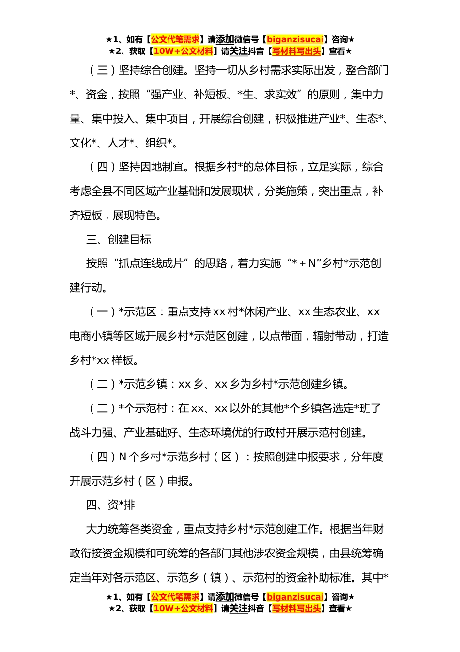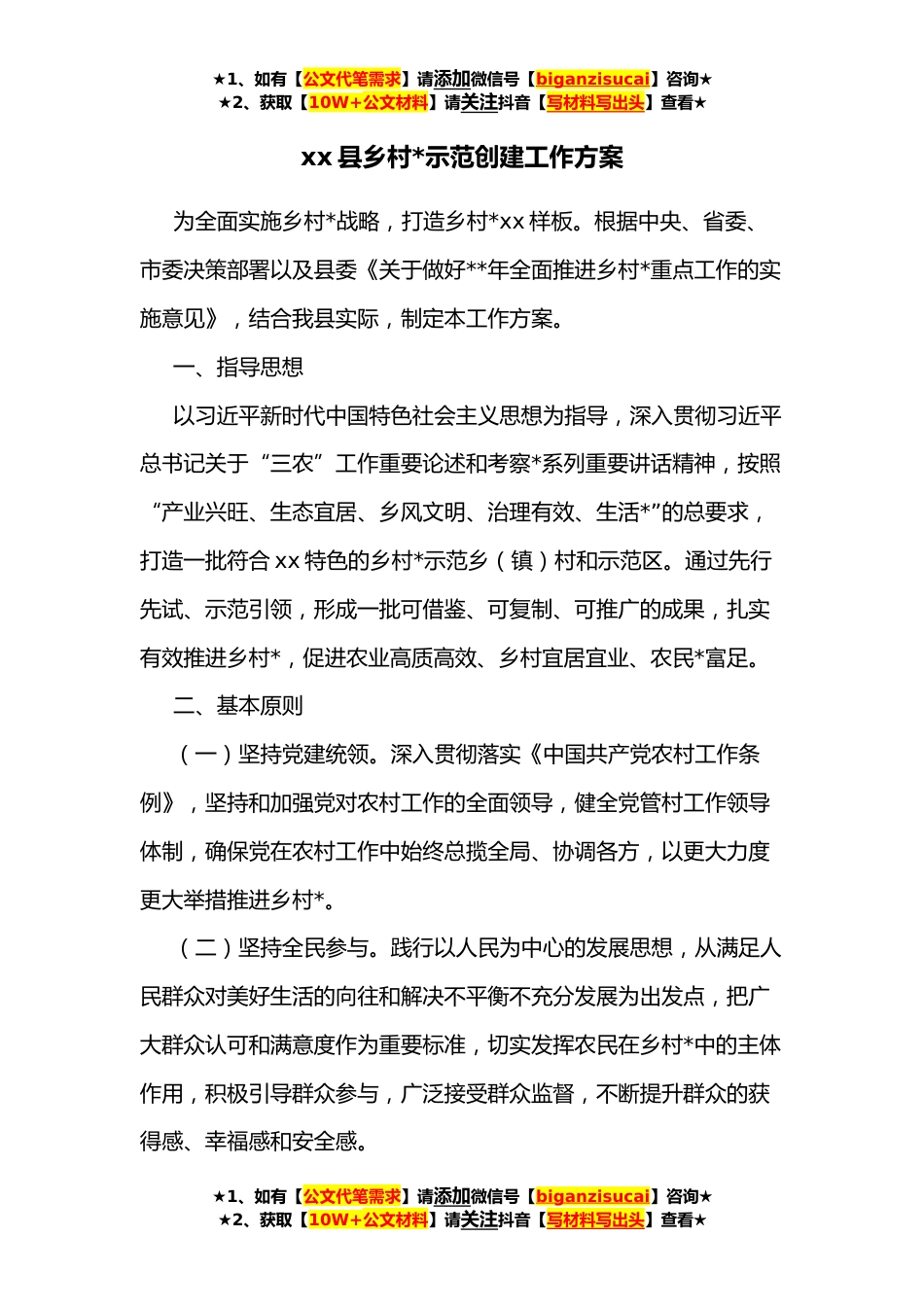★1、如有【公文代笔需求】请添加微信号【biganzisucai】咨询★★2、获取【10W+公文材料】请关注抖音【写材料写出头】查看★xx县乡村*示范创建工作方案为全面实施乡村*战略,打造乡村*xx样板。根据中央、省委、市委决策部署以及县委《关于做好**年全面推进乡村*重点工作的实施意见》,结合我县实际,制定本工作方案。一、指导思想以习近平新时代中国特色社会主义思想为指导,深入贯彻习近平总书记关于“三农”工作重要论述和考察*系列重要讲话精神,按照“产业兴旺、生态宜居、乡风文明、治理有效、生活*”的总要求,打造一批符合xx特色的乡村*示范乡(镇)村和示范区。通过先行先试、示范引领,形成一批可借鉴、可复制、可推广的成果,扎实有效推进乡村*,促进农业高质高效、乡村宜居宜业、农民*富足。二、基本原...