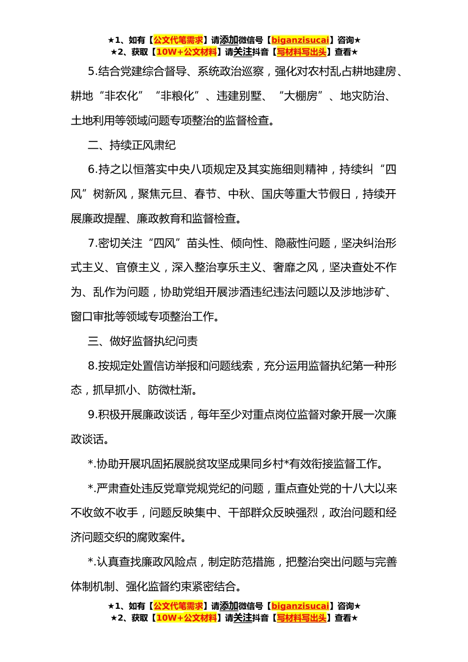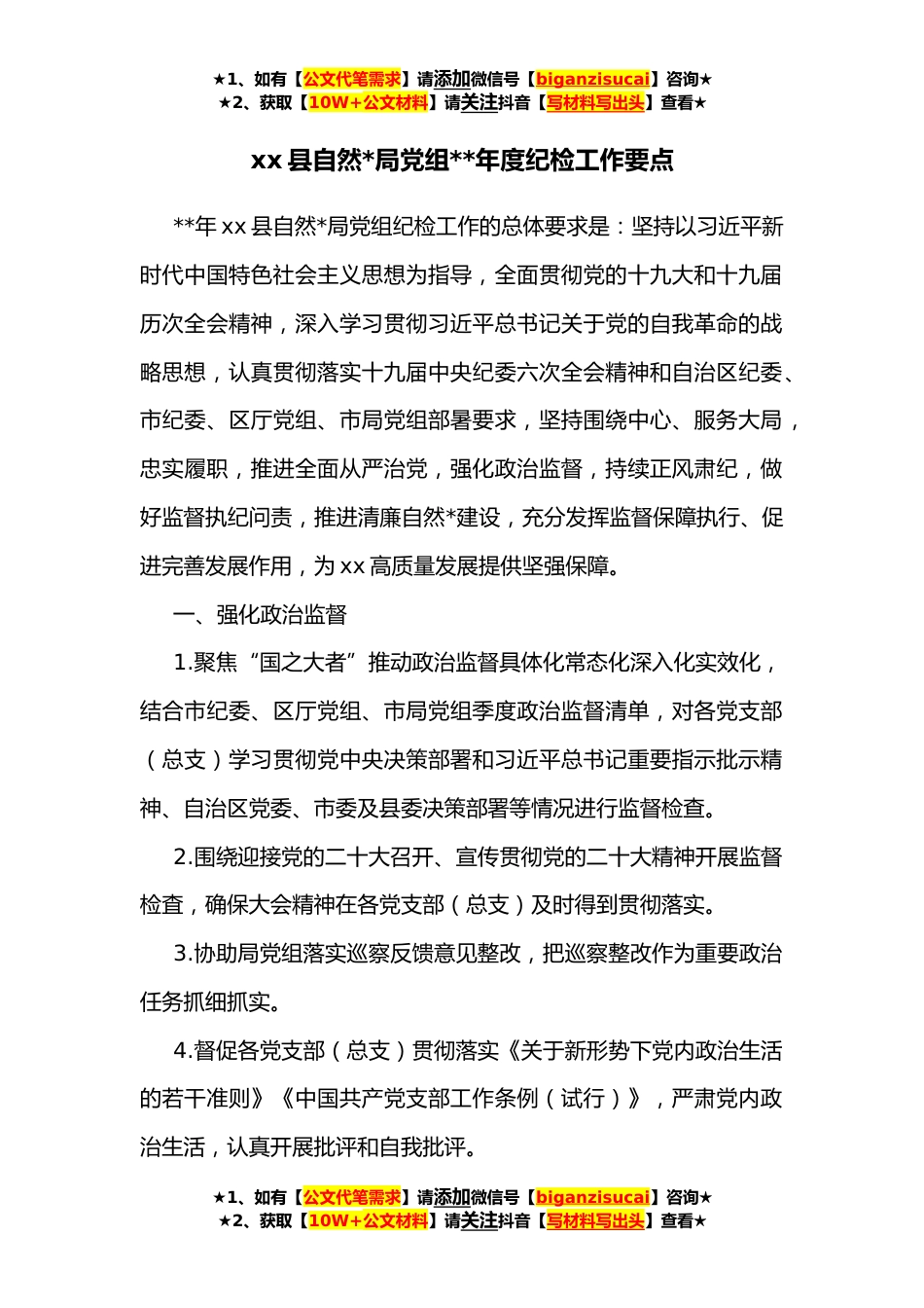 ★1、如有【公文代笔需求】请添加微信号【biganzisucai】咨询★★2、获取【10W+公文材料】请关注抖音【写材料写出头】查看★xx县自然*局党组**年度纪检工作要点**年xx县自然*局党组纪检工作的总体要求是:坚持以习近平新时代中国特色社会主义思想为指导,全面贯彻党的十九大和十九届历次全会精神,深入学习贯彻习近平总书记关于党的自我革命的战略思想,认真贯彻落实十九届中央纪委六次全会精神和自治区纪委、市纪委、区厅党组、市局党组部暑要求,坚持围绕中心、服务大局,忠实履职,推进全面从严治党,强化政治监督,持续正风肃纪,做好监督执纪问责,推进清廉自然*建设,充分发挥监督保障执行、促进完善发展作用,为xx高质量发展提供坚强保障。一、强化政治监督1.聚焦“国之大者”推动政治监督具体化常态化深入...