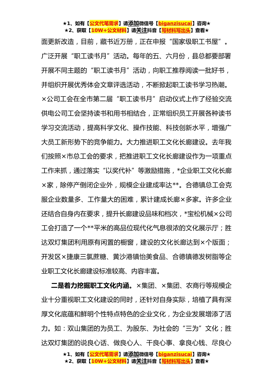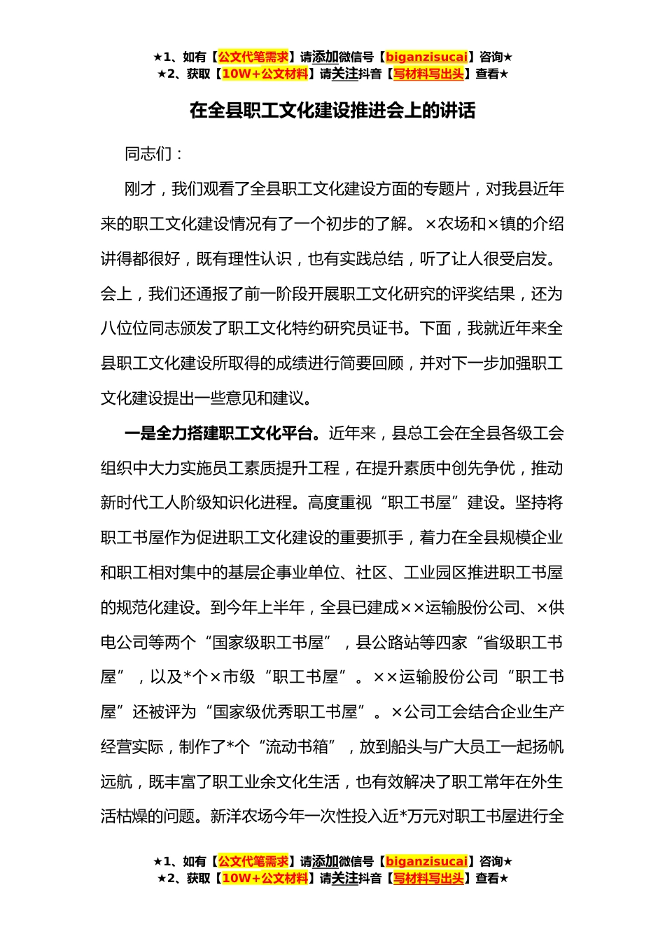 ★1、如有【公文代笔需求】请添加微信号【biganzisucai】咨询★★2、获取【10W+公文材料】请关注抖音【写材料写出头】查看★在全县职工文化建设推进会上的讲话同志们:刚才,我们观看了全县职工文化建设方面的专题片,对我县近年来的职工文化建设情况有了一个初步的了解。×农场和×镇的介绍讲得都很好,既有理性认识,也有实践总结,听了让人很受启发。会上,我们还通报了前一阶段开展职工文化研究的评奖结果,还为八位位同志颁发了职工文化特约研究员证书。下面,我就近年来全县职工文化建设所取得的成绩进行简要回顾,并对下一步加强职工文化建设提出一些意见和建议。一是全力搭建职工文化平台。近年来,县总工会在全县各级工会组织中大力实施员工素质提升工程,在提升素质中创先争优,推动新时代工人阶级知识...