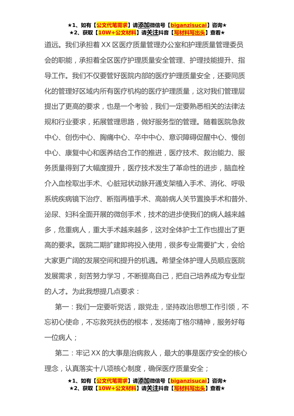 ★1、如有【公文代笔需求】请添加微信号【biganzisucai】咨询★★2、获取【10W+公文材料】请关注抖音【写材料写出头】查看★医院院长在**“国际护士节”大会上的讲话尊敬的主席、尉董事长、各位领导、各位*,大家下午好!首先,向长期奋斗在临床一线的护理人员致以节日的问候,感谢大家为医疗护理质量与安全所做的工作,为提升群众就医感受所做的努力,为医院发展所做的贡献!也借此机会向夏主席、向省工会和长期以来关心、支持我院的所有的组织和机构表示衷心的感谢。此时此刻,首先要说的是我很受感动,感动之一:省工会夏主席在百忙之中能够亲自出席今天的活动,并给我们带来了鼓励和问候;感动之二:是大家的表演如此的精彩,因为医院病人多,疫情防控任务重,大家工作确实非常繁忙,很多同志是下了夜班不休息...