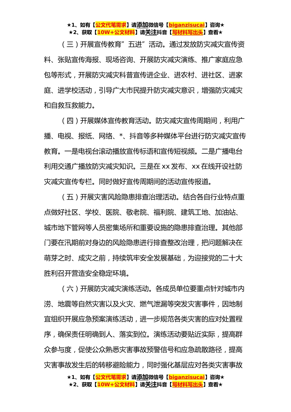 ★1、如有【公文代笔需求】请添加微信号【biganzisucai】咨询★★2、获取【10W+公文材料】请关注抖音【写材料写出头】查看★xx县**年全国”防灾减灾日”宣传周活动方案为深入贯彻落实习近平总书记关于防灾减灾救灾重要论述,做好今年全国防灾减灾日各项工作,制定如下活动方案。一、活动主题减轻灾害风险守护美好家园二、活动时间今年**日是我国第*个全国防灾减灾日,**至*日为防灾减灾宣传周。三、活动内容及责任单位(一)开展公益宣传。一是县科工信局协调中国移动、中国联通、中国电信等运营商,通过手机短信、互联网等工具,宣传普及防灾减灾救灾知识。二是县*局、县住房和城乡建设局、县城市管理局、县商务局、县交通运输局分别在重要交通路口、xxx广场、xx广场、xx广场、各大商场大屏、公交车、出租车滚动...