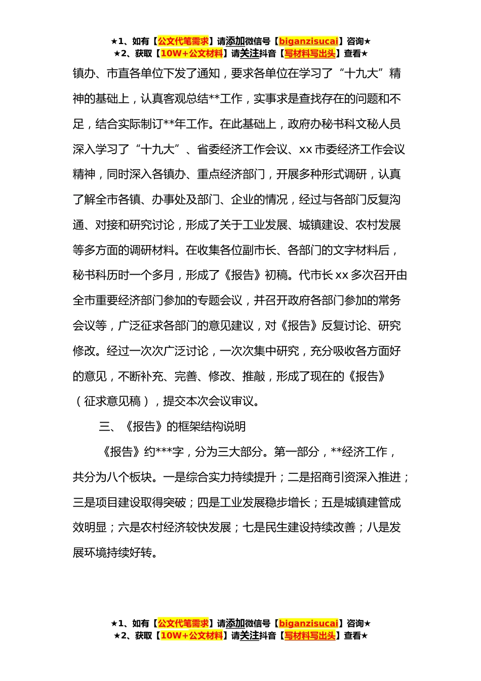 ★1、如有【公文代笔需求】请添加微信号【biganzisucai】咨询★★2、获取【10W+公文材料】请关注抖音【写材料写出头】查看★政府工作报告(征求意见稿)起草说明按照会议安排,我把《政府工作报告》征求意见稿(以下简称报告)起草情况说明如下:一、《报告》的总体要求在xx市人民政府四届三次和四届四次常务会议上,代市长xx对**年政府工作报告起草工作提出明确要求,要求各位副市长专题听取分管部门**工作汇报并认真调研,实事求是总结今年成绩和亮点,结合“十九大”精神及中央、省委、xx市委经济工作会议及精神和《*经济区建设规划》、xx城市组团发展实际,理清**年工作思路,本着“跳起来摘桃子”的精神,制订**年工作目标、重点项目和推进措施,然后提交市政府常务会议、市委常委会讨论,广泛征求市人大代表...