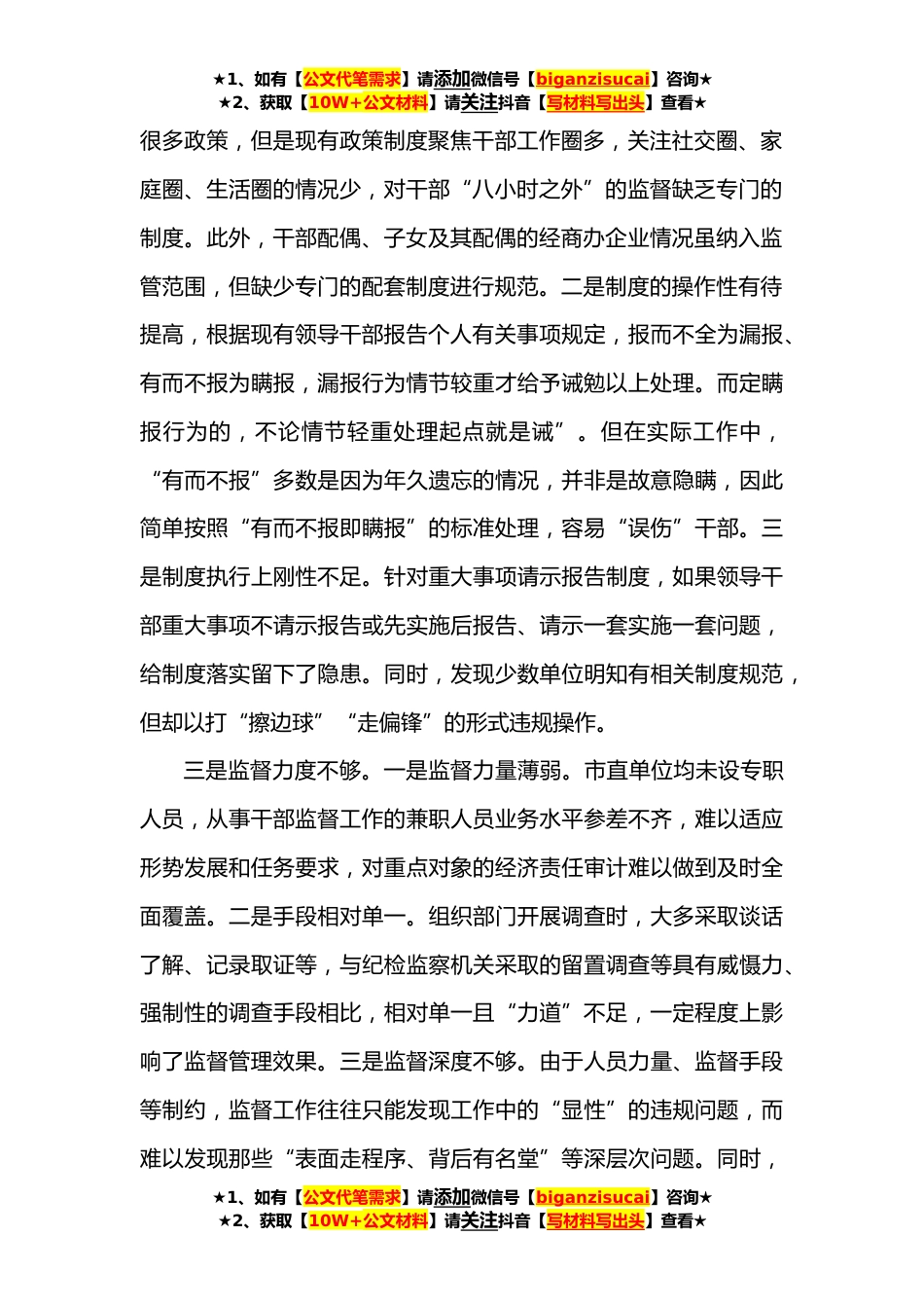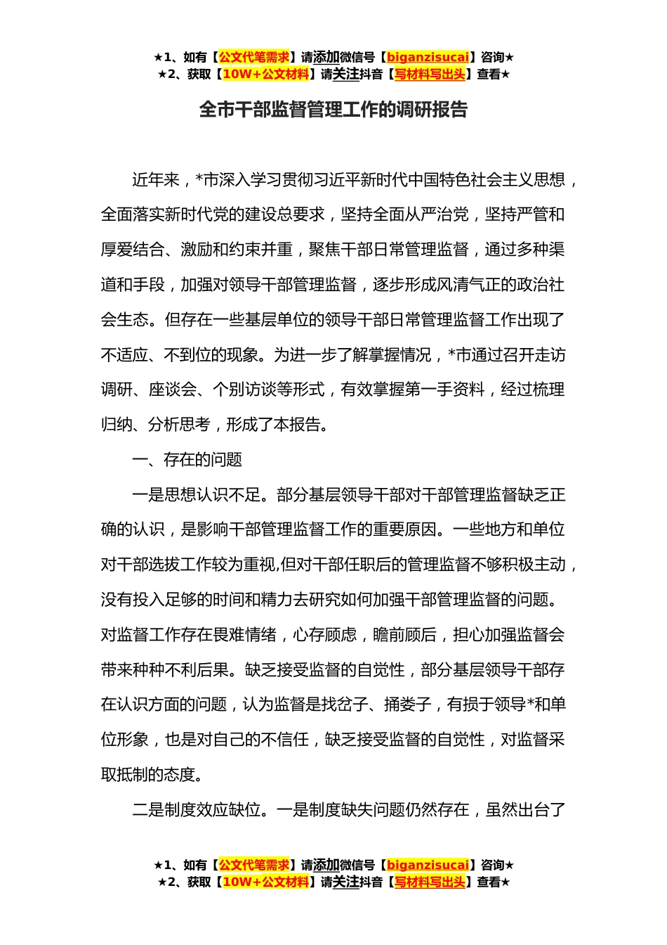 ★1、如有【公文代笔需求】请添加微信号【biganzisucai】咨询★★2、获取【10W+公文材料】请关注抖音【写材料写出头】查看★全市干部监督管理工作的调研报告近年来,*市深入学习贯彻习近平新时代中国特色社会主义思想,全面落实新时代党的建设总要求,坚持全面从严治党,坚持严管和厚爱结合、激励和约束并重,聚焦干部日常管理监督,通过多种渠道和手段,加强对领导干部管理监督,逐步形成风清气正的政治社会生态。但存在一些基层单位的领导干部日常管理监督工作出现了不适应、不到位的现象。为进一步了解掌握情况,*市通过召开走访调研、座谈会、个别访谈等形式,有效掌握第一手资料,经过梳理归纳、分析思考,形成了本报告。一、存在的问题一是思想认识不足。部分基层领导干部对干部管理监督缺乏正确的认识,是...