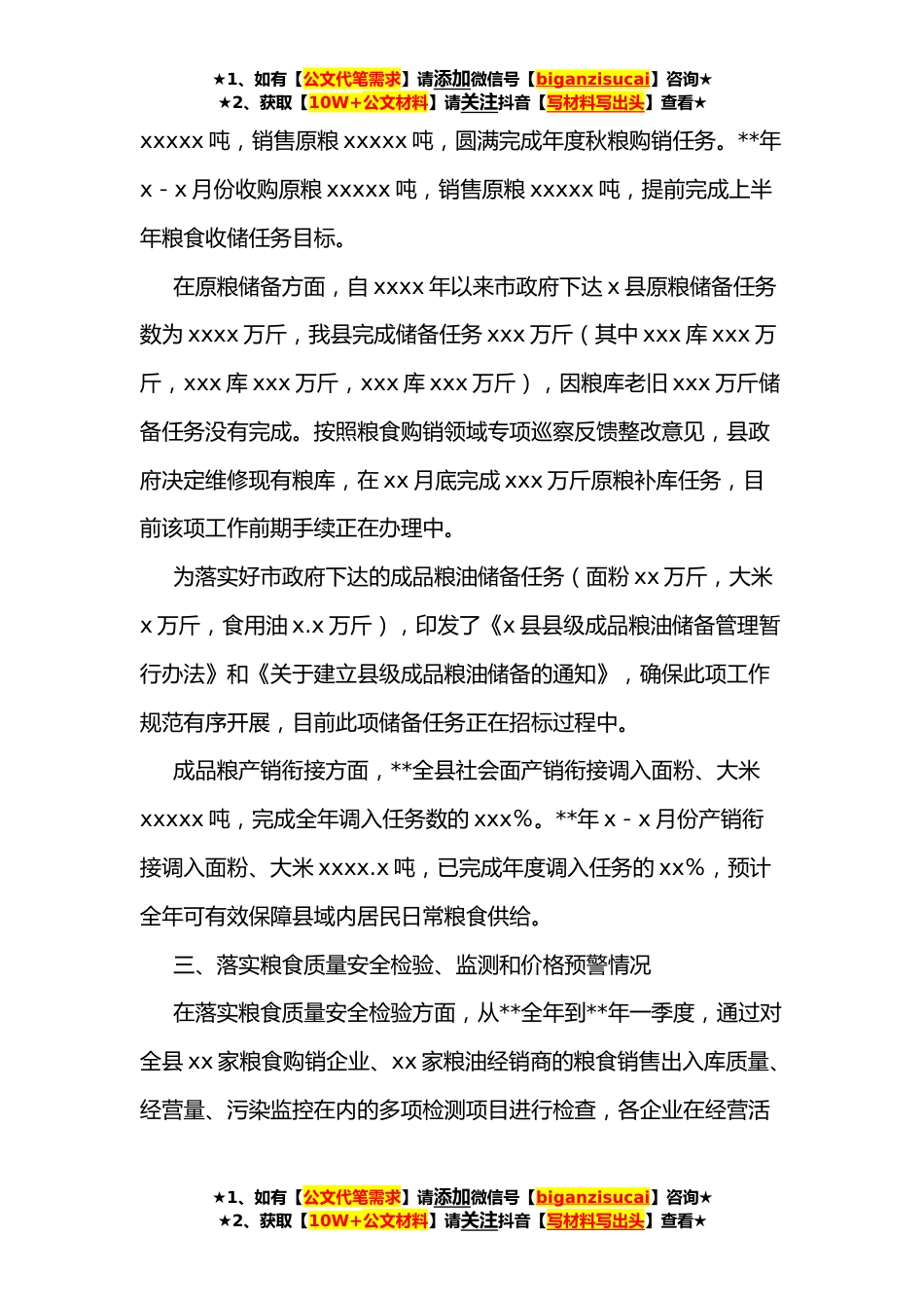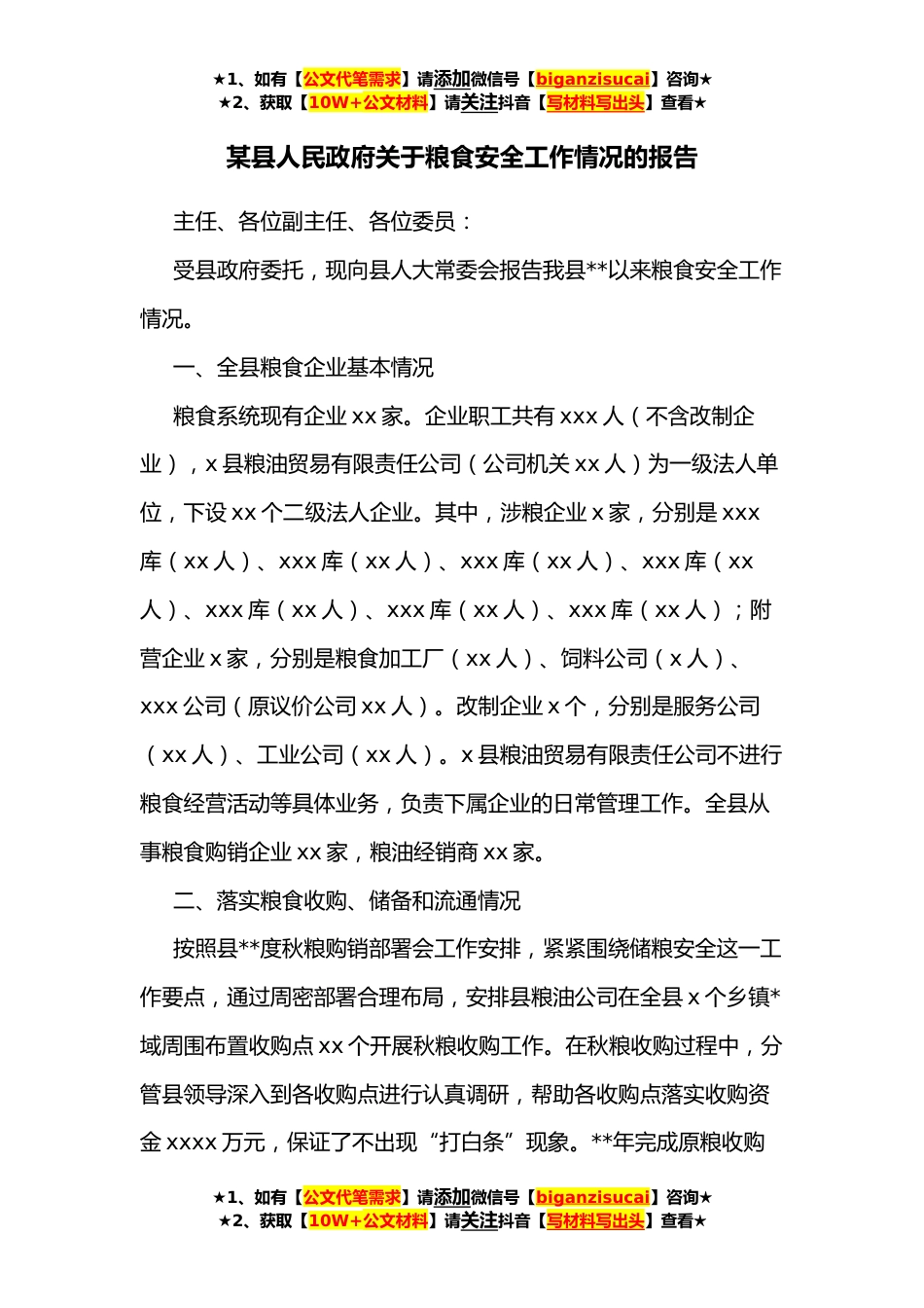 ★1、如有【公文代笔需求】请添加微信号【biganzisucai】咨询★★2、获取【10W+公文材料】请关注抖音【写材料写出头】查看★某县人民政府关于粮食安全工作情况的报告主任、各位副主任、各位委员:受县政府委托,现向县人大常委会报告我县**以来粮食安全工作情况。一、全县粮食企业基本情况粮食系统现有企业xx家。企业职工共有xxx人(不含改制企业),x县粮油贸易有限责任公司(公司机关xx人)为一级法人单位,下设xx个二级法人企业。其中,涉粮企业x家,分别是xxx库(xx人)、xxx库(xx人)、xxx库(xx人)、xxx库(xx人)、xxx库(xx人)、xxx库(xx人)、xxx库(xx人);附营企业x家,分别是粮食加工厂(xx人)、饲料公司(x人)、xxx公司(原议价公司xx人)。改制企业x个,分别是服务公司(xx人)、工业公司(x...