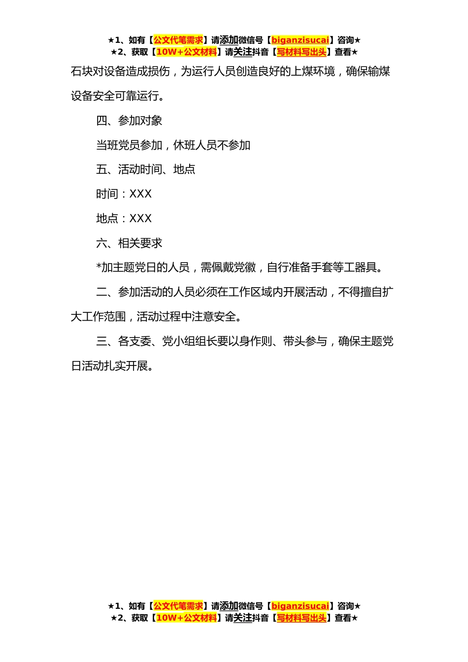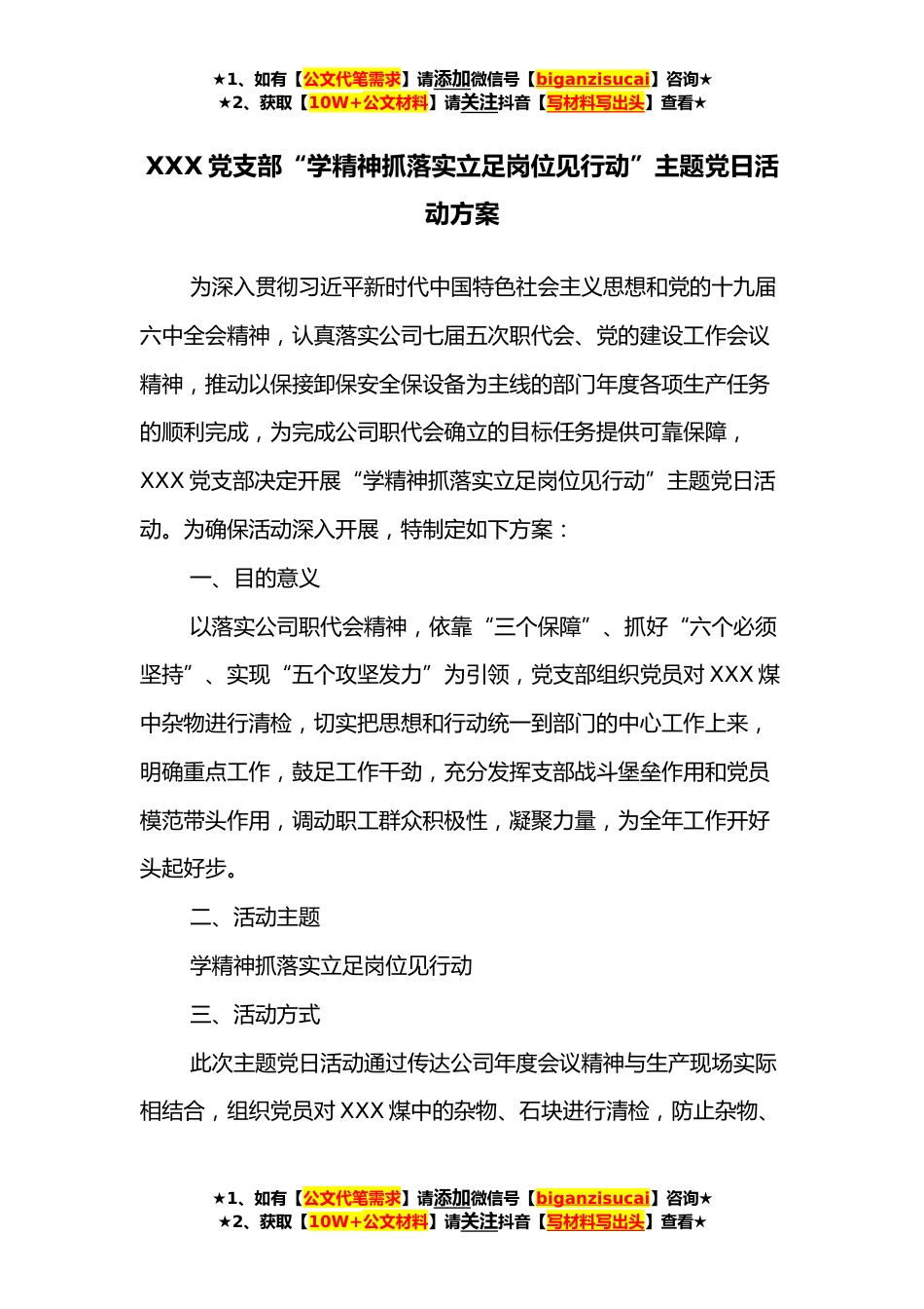 ★1、如有【公文代笔需求】请添加微信号【biganzisucai】咨询★★2、获取【10W+公文材料】请关注抖音【写材料写出头】查看★XXX党支部“学精神抓落实立足岗位见行动”主题党日活动方案为深入贯彻习近平新时代中国特色社会主义思想和党的十九届六中全会精神,认真落实公司七届五次职代会、党的建设工作会议精神,推动以保接卸保安全保设备为主线的部门年度各项生产任务的顺利完成,为完成公司职代会确立的目标任务提供可靠保障,XXX党支部决定开展“学精神抓落实立足岗位见行动”主题党日活动。为确保活动深入开展,特制定如下方案:一、目的意义以落实公司职代会精神,依靠“三个保障”、抓好“六个必须坚持”、实现“五个攻坚发力”为引领,党支部组织党员对XXX煤中杂物进行清检,切实把思想和行动统一到部门的中...