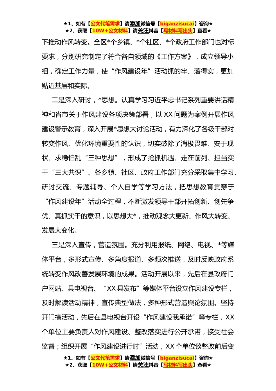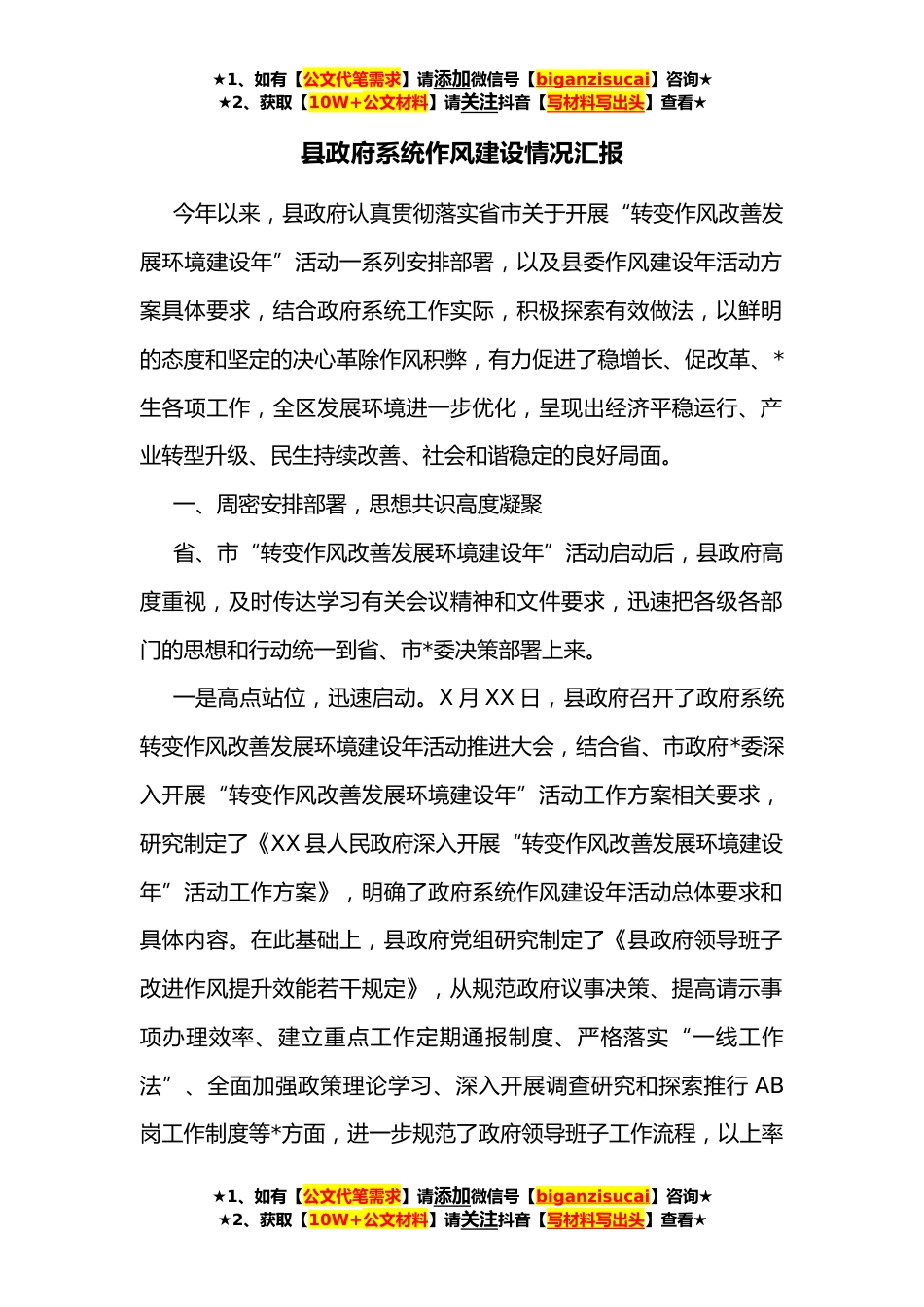 ★1、如有【公文代笔需求】请添加微信号【biganzisucai】咨询★★2、获取【10W+公文材料】请关注抖音【写材料写出头】查看★县政府系统作风建设情况汇报今年以来,县政府认真贯彻落实省市关于开展“转变作风改善发展环境建设年”活动一系列安排部署,以及县委作风建设年活动方案具体要求,结合政府系统工作实际,积极探索有效做法,以鲜明的态度和坚定的决心革除作风积弊,有力促进了稳增长、促改革、*生各项工作,全区发展环境进一步优化,呈现出经济平稳运行、产业转型升级、民生持续改善、社会和谐稳定的良好局面。一、周密安排部署,思想共识高度凝聚省、市“转变作风改善发展环境建设年”活动启动后,县政府高度重视,及时传达学习有关会议精神和文件要求,迅速把各级各部门的思想和行动统一到省、市*委决策...