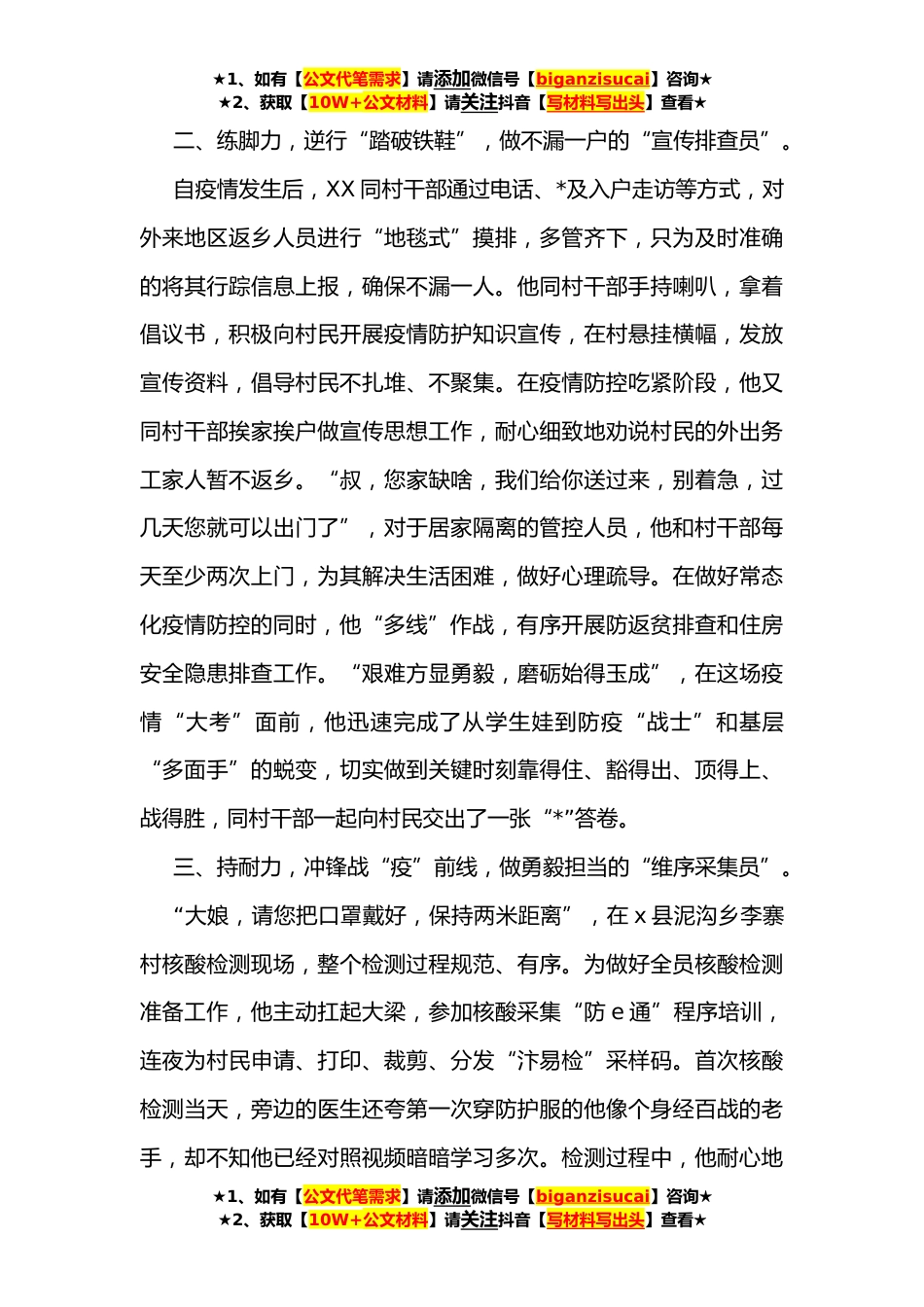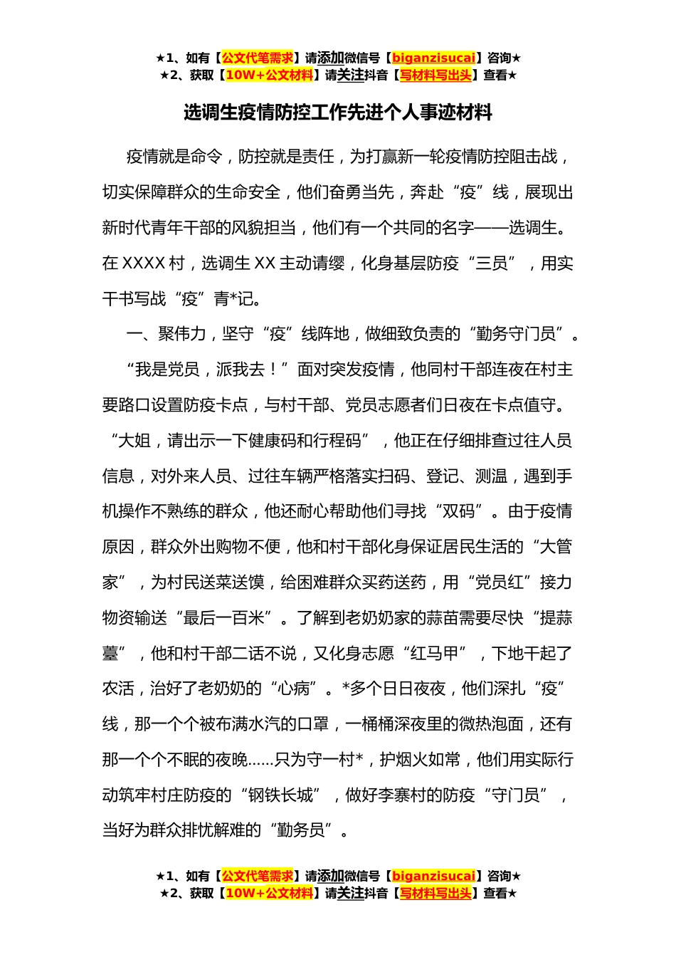 ★1、如有【公文代笔需求】请添加微信号【biganzisucai】咨询★★2、获取【10W+公文材料】请关注抖音【写材料写出头】查看★选调生疫情防控工作先进个人事迹材料疫情就是命令,防控就是责任,为打赢新一轮疫情防控阻击战,切实保障群众的生命安全,他们奋勇当先,奔赴“疫”线,展现出新时代青年干部的风貌担当,他们有一个共同的名字——选调生。在XXXX村,选调生XX主动请缨,化身基层防疫“三员”,用实干书写战“疫”青*记。一、聚伟力,坚守“疫”线阵地,做细致负责的“勤务守门员”。“我是党员,派我去!”面对突发疫情,他同村干部连夜在村主要路口设置防疫卡点,与村干部、党员志愿者们日夜在卡点值守。“大姐,请出示一下健康码和行程码”,他正在仔细排查过往人员信息,对外来人员、过往车辆严格落实扫...