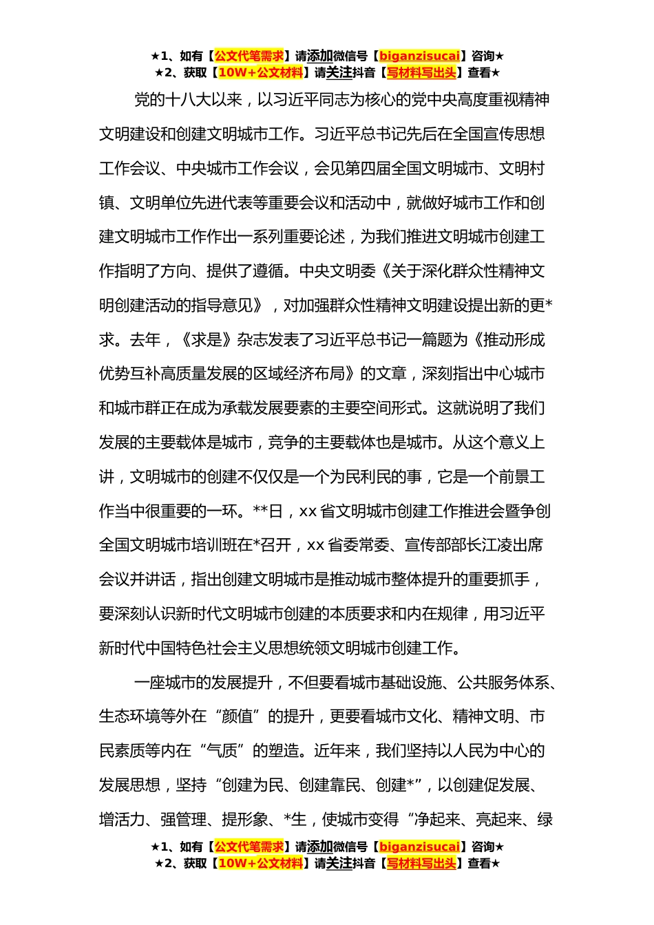 ★1、如有【公文代笔需求】请添加微信号【biganzisucai】咨询★★2、获取【10W+公文材料】请关注抖音【写材料写出头】查看★在创建全国文明城市推进会上的讲话同志们:经市委、市政府研究,今天我们召开创建全国文明城市加压推进会。主要任务是对我市创建全国文明城市工作进行再安排再部署,广泛动员全市上下,“拧紧螺丝、上紧发条”,以决战决胜、冲刺冲锋的姿态,奋力夺取全国文明城市这块“金字招牌”。刚才,我们观看文明城市创建专题片,xx部长传达了全省文明城市创建工作会议精神,指出了创建中存在的严重问题,并对下一步的工作内容、工作标准、工作要求进行了安排部署,希望大家对照任务清单、盯住节点、兑现承诺,不折不扣抓好贯彻落实。下面,我讲几点意见。一、提高站位,坚定必胜信心创建全国文明城...