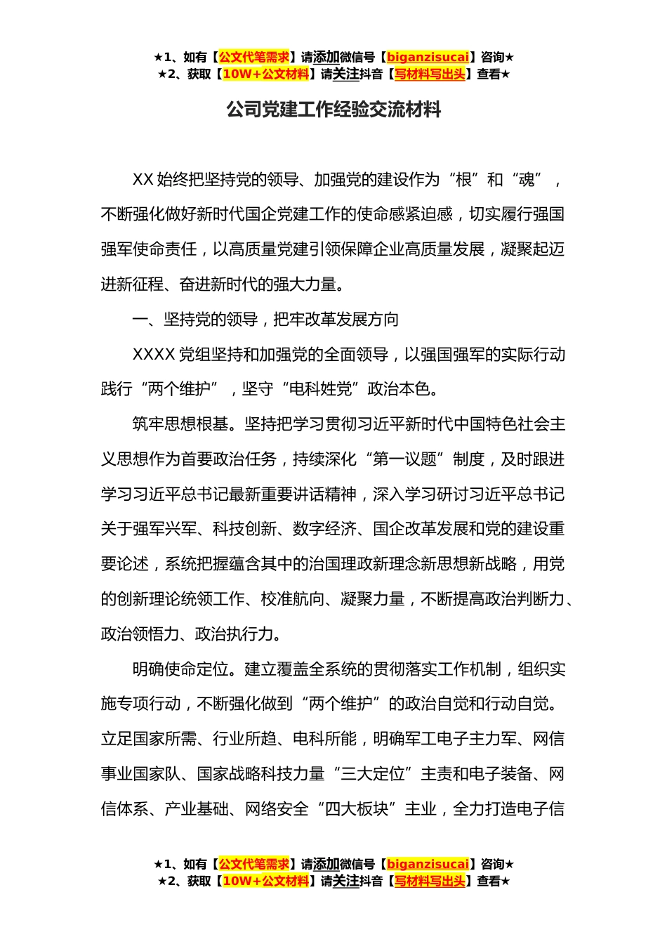 ★1、如有【公文代笔需求】请添加微信号【biganzisucai】咨询★★2、获取【10W+公文材料】请关注抖音【写材料写出头】查看★公司党建工作经验交流材料XX始终把坚持党的领导、加强党的建设作为“根”和“魂”,不断强化做好新时代国企党建工作的使命感紧迫感,切实履行强国强军使命责任,以高质量党建引领保障企业高质量发展,凝聚起迈进新征程、奋进新时代的强大力量。一、坚持党的领导,把牢改革发展方向XXXX党组坚持和加强党的全面领导,以强国强军的实际行动践行“两个维护”,坚守“电科姓党”政治本色。筑牢思想根基。坚持把学习贯彻习近平新时代中国特色社会主义思想作为首要政治任务,持续深化“第一议题”制度,及时跟进学习习近平总书记最新重要讲话精神,深入学习研讨习近平总书记关于强军兴军、科技创...
