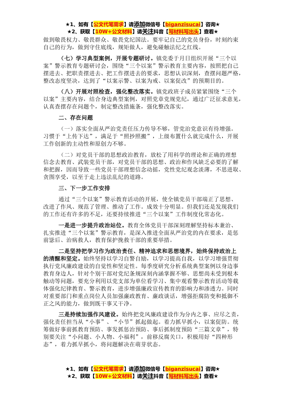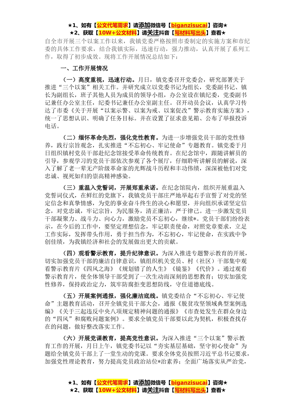 ★1、如有【公文代笔需求】请添加微信号【biganzisucai】咨询★★2、获取【10W+公文材料】请关注抖音【写材料写出头】查看★自全市开展三个以案工作以来,我镇党委严格按照市委制定的实施方案和市纪委的具体工作要求,结合我镇实际,迅速行动,强力推动,认真开展了系列工作,取得了初步成效。现将工作开展情况总结如下:一、工作开展情况(一)高度重视,迅速行动。月日,镇党委召开党委会,研究部署关于推进“三个以案”相关工作。并研究成立以党委书记为组长,党委副书记、镇长为副组长,班子其他人员为成员的领导小组,办公室设在镇纪委,党委副书记兼任办公室主任,纪委书记兼任办公室副主任。召开动员会议,认真学习传达了市委《关于开展“以案示警、以案为戒、以案促改”警示教育实施方案》,统一了思想认...