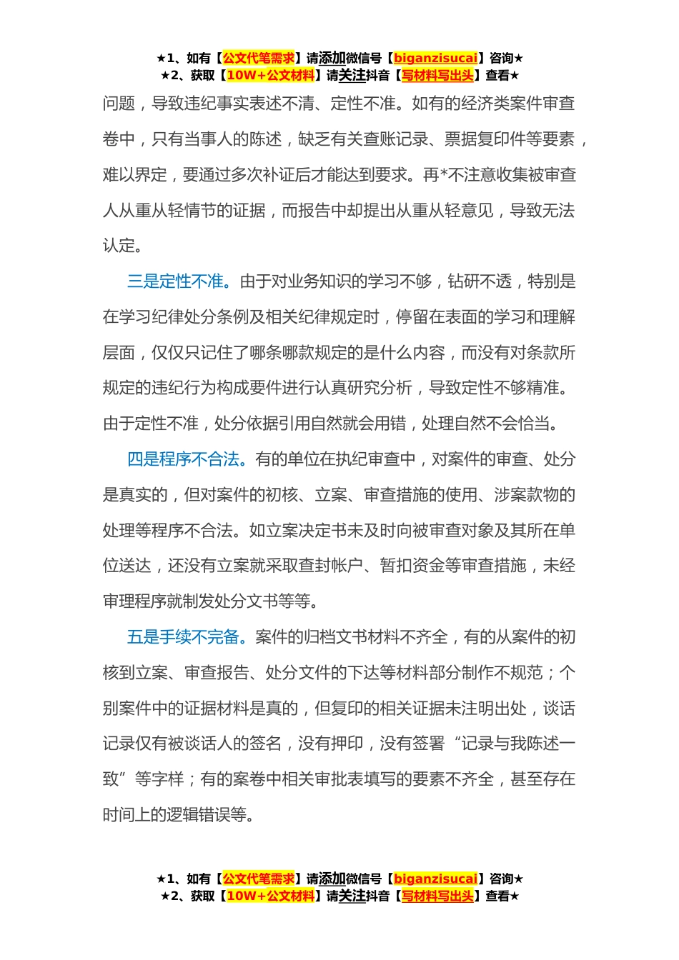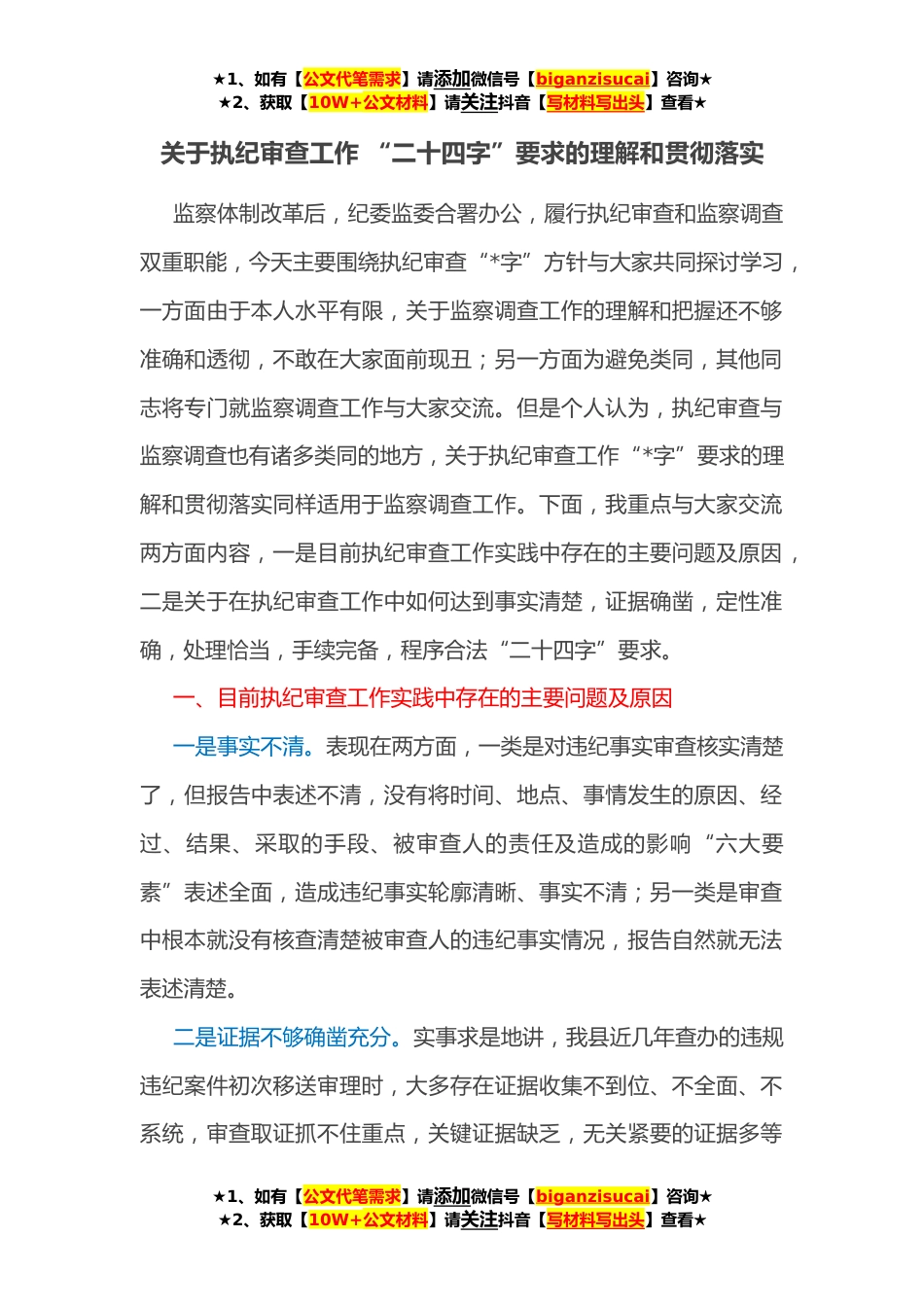 ★1、如有【公文代笔需求】请添加微信号【biganzisucai】咨询★★2、获取【10W+公文材料】请关注抖音【写材料写出头】查看★关于执纪审查工作“二十四字”要求的理解和贯彻落实监察体制改革后,纪委监委合署办公,履行执纪审查和监察调查双重职能,今天主要围绕执纪审查“*字”方针与大家共同探讨学习,一方面由于本人水平有限,关于监察调查工作的理解和把握还不够准确和透彻,不敢在大家面前现丑;另一方面为避免类同,其他同志将专门就监察调查工作与大家交流。但是个人认为,执纪审查与监察调查也有诸多类同的地方,关于执纪审查工作“*字”要求的理解和贯彻落实同样适用于监察调查工作。下面,我重点与大家交流两方面内容,一是目前执纪审查工作实践中存在的主要问题及原因,二是关于在执纪审查工作中如何达...