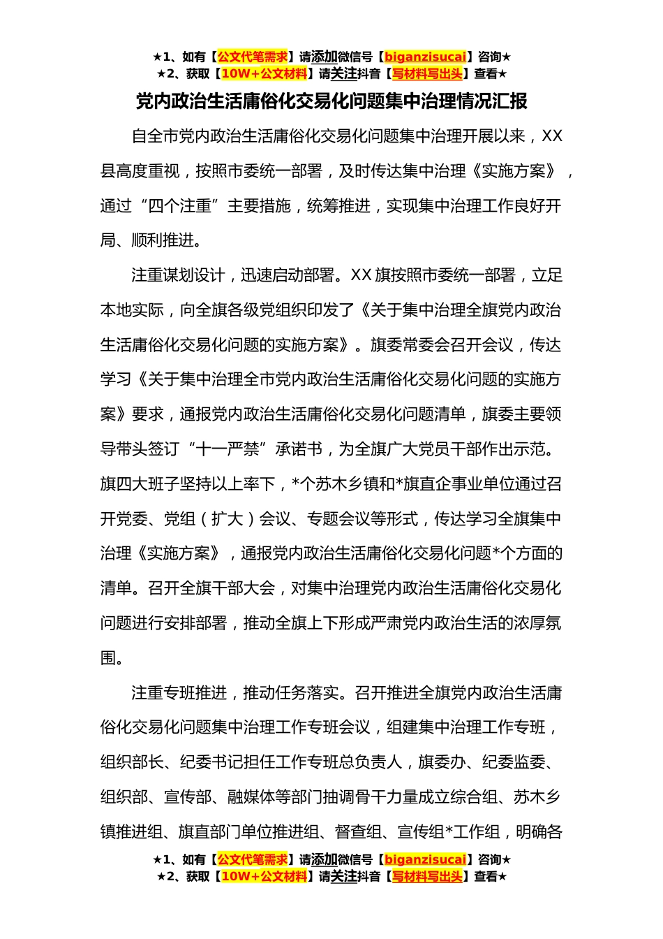 ★1、如有【公文代笔需求】请添加微信号【biganzisucai】咨询★★2、获取【10W+公文材料】请关注抖音【写材料写出头】查看★党内政治生活庸俗化交易化问题集中治理情况汇报自全市党内政治生活庸俗化交易化问题集中治理开展以来,XX县高度重视,按照市委统一部署,及时传达集中治理《实施方案》,通过“四个注重”主要措施,统筹推进,实现集中治理工作良好开局、顺利推进。注重谋划设计,迅速启动部署。XX旗按照市委统一部署,立足本地实际,向全旗各级党组织印发了《关于集中治理全旗党内政治生活庸俗化交易化问题的实施方案》。旗委常委会召开会议,传达学习《关于集中治理全市党内政治生活庸俗化交易化问题的实施方案》要求,通报党内政治生活庸俗化交易化问题清单,旗委主要领导带头签订“十一严禁”承诺书,...