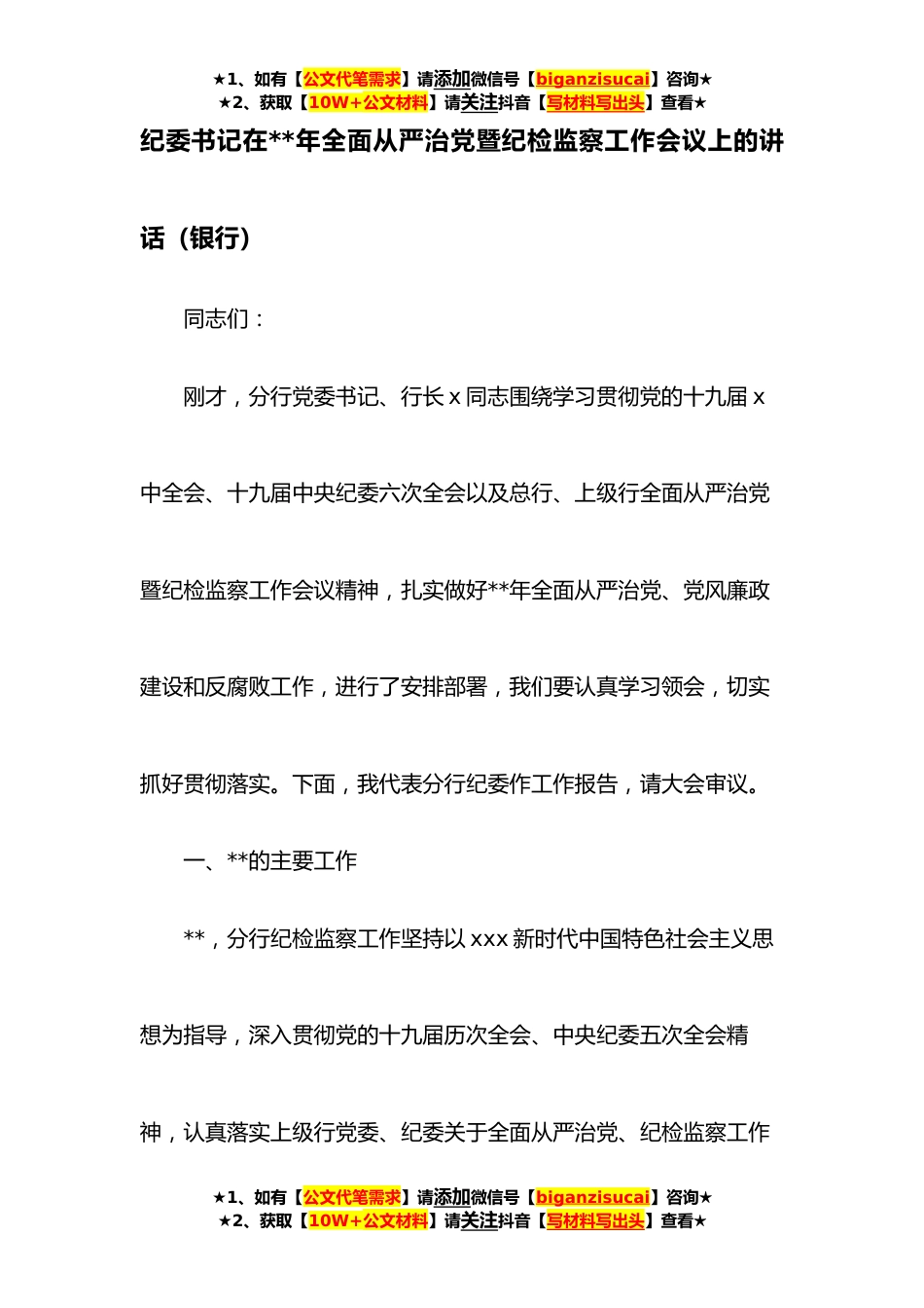 ★1、如有【公文代笔需求】请添加微信号【biganzisucai】咨询★★2、获取【10W+公文材料】请关注抖音【写材料写出头】查看★纪委书记在**年全面从严治党暨纪检监察工作会议上的讲话(银行)同志们:刚才,分行党委书记、行长x同志围绕学习贯彻党的十九届x中全会、十九届中央纪委六次全会以及总行、上级行全面从严治党暨纪检监察工作会议精神,扎实做好**年全面从严治党、党风廉政建设和反腐败工作,进行了安排部署,我们要认真学习领会,切实抓好贯彻落实。下面,我代表分行纪委作工作报告,请大会审议。一、**的主要工作**,分行纪检监察工作坚持以xxx新时代中国特色社会主义思想为指导,深入贯彻党的十九届历次全会、中央纪委五次全会精神,认真落实上级行党委、纪委关于全面从严治党、纪检监察工作★1、如有【...