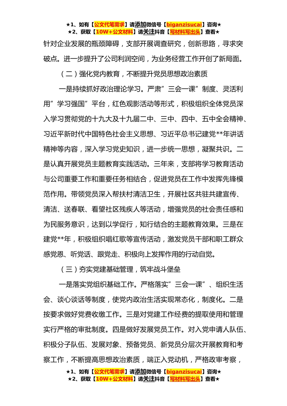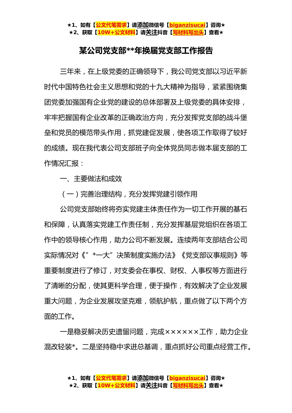 ★1、如有【公文代笔需求】请添加微信号【biganzisucai】咨询★★2、获取【10W+公文材料】请关注抖音【写材料写出头】查看★某公司党支部**年换届党支部工作报告三年来,在上级党委的正确领导下,我公司党支部以习近平新时代中国特色社会主义思想和党的十九大精神为指导,紧紧围绕集团党委加强国有企业党的建设的总体部署及上级党委的具体安排,牢牢把握国有企业改革的正确政治方向,充分发挥党支部的战斗堡垒和党员的模范带头作用,抓党建促发展,使各项工作取得了较好的成绩。现在我代表公司支部班子向全体党员同志做本届支部的工作情况汇报:一、主要做法和成效(一)完善治理结构,充分发挥党建引领作用公司党支部始终将夯实党建主体责任作为一切工作开展的基石和保障,认真落实党建工作责任制,充分发挥基层...