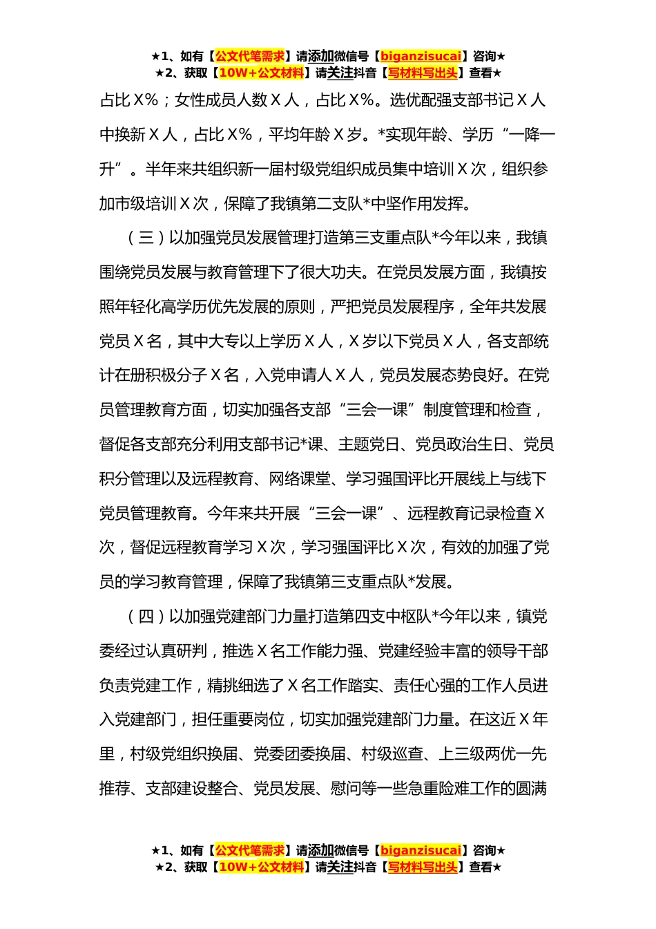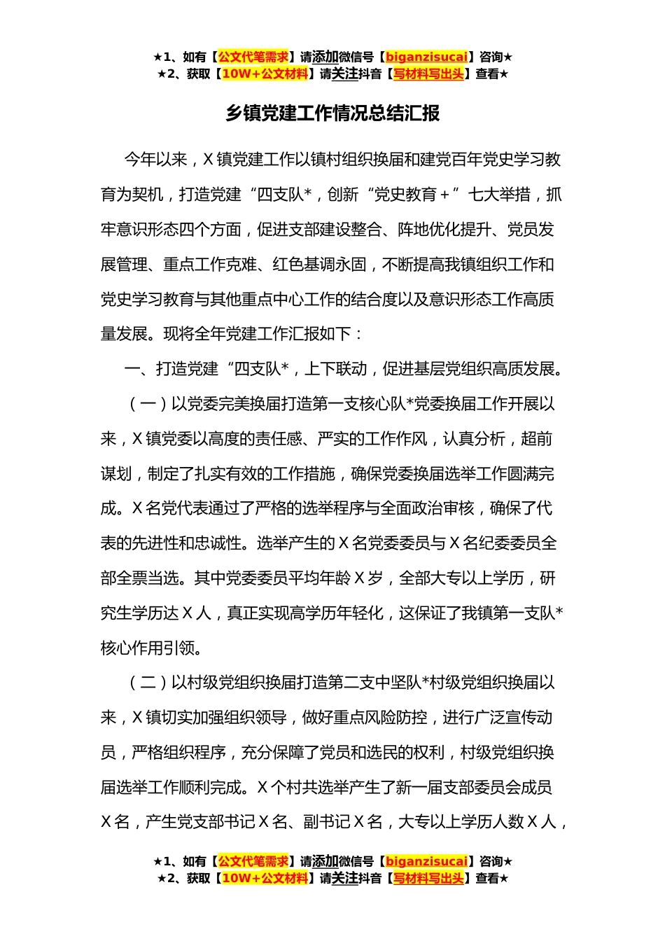 ★1、如有【公文代笔需求】请添加微信号【biganzisucai】咨询★★2、获取【10W+公文材料】请关注抖音【写材料写出头】查看★乡镇党建工作情况总结汇报今年以来,X镇党建工作以镇村组织换届和建党百年党史学习教育为契机,打造党建“四支队*,创新“党史教育+”七大举措,抓牢意识形态四个方面,促进支部建设整合、阵地优化提升、党员发展管理、重点工作克难、红色基调永固,不断提高我镇组织工作和党史学习教育与其他重点中心工作的结合度以及意识形态工作高质量发展。现将全年党建工作汇报如下:一、打造党建“四支队*,上下联动,促进基层党组织高质发展。(一)以党委完美换届打造第一支核心队*党委换届工作开展以来,X镇党委以高度的责任感、严实的工作作风,认真分析,超前谋划,制定了扎实有效的工作措施,...