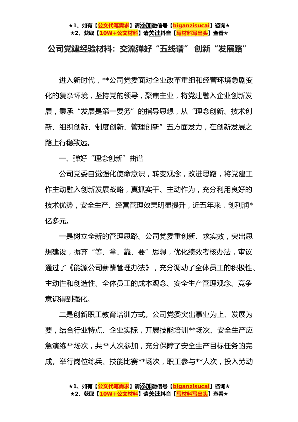 ★1、如有【公文代笔需求】请添加微信号【biganzisucai】咨询★★2、获取【10W+公文材料】请关注抖音【写材料写出头】查看★公司党建经验材料:交流弹好“五线谱”创新“发展路”进入新时代,**公司党委面对企业改革重组和经营环境急剧变化的复杂环境,坚持党的领导,聚焦主业,将党建融入企业创新发展,秉承“发展是第一要务”的指导思想,从“理念创新、技术创新、组织创新、制度创新、管理创新”五方面发力,在创新发展之路上行稳致远。一、弹好“理念创新”曲谱公司党委自觉强化使命意识,转变观念,改进思路,将党建工作主动融入创新发展战略,真抓实干、主动作为,充分利用良好的技术优势,安全生产、经营管理效果明显提升,近五年来,创利润*亿多元。一是树立全新的管理思路。公司党委重创新、求实效,突出...