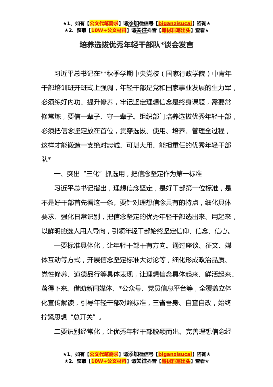★1、如有【公文代笔需求】请添加微信号【biganzisucai】咨询★★2、获取【10W+公文材料】请关注抖音【写材料写出头】查看★培养选拔优秀年轻干部队*谈会发言习近平总书记在**秋季学期中央党校(国家行政学院)中青年干部培训班开班式上强调,年轻干部是党和国家事业发展的生力军,必须练好内功、提升修养,牢记坚定理想信念是终身课题,需要常修常炼,要信一辈子、守一辈子。组织部门培养选拔优秀年轻干部,必须把信念坚定放在首位,贯穿选拔、使用、培养、管理全过程,这样才能锻造一支绝对忠诚、可堪大用、能担重任的优秀年轻干部队*一、突出“三化”抓选用,把信念坚定作为第一标准习近平总书记指出,理想信念坚定,是好干部第一位标准,是不是好干部首先看这一条。要针对理想信念具有的特点,细化具体要求、...
