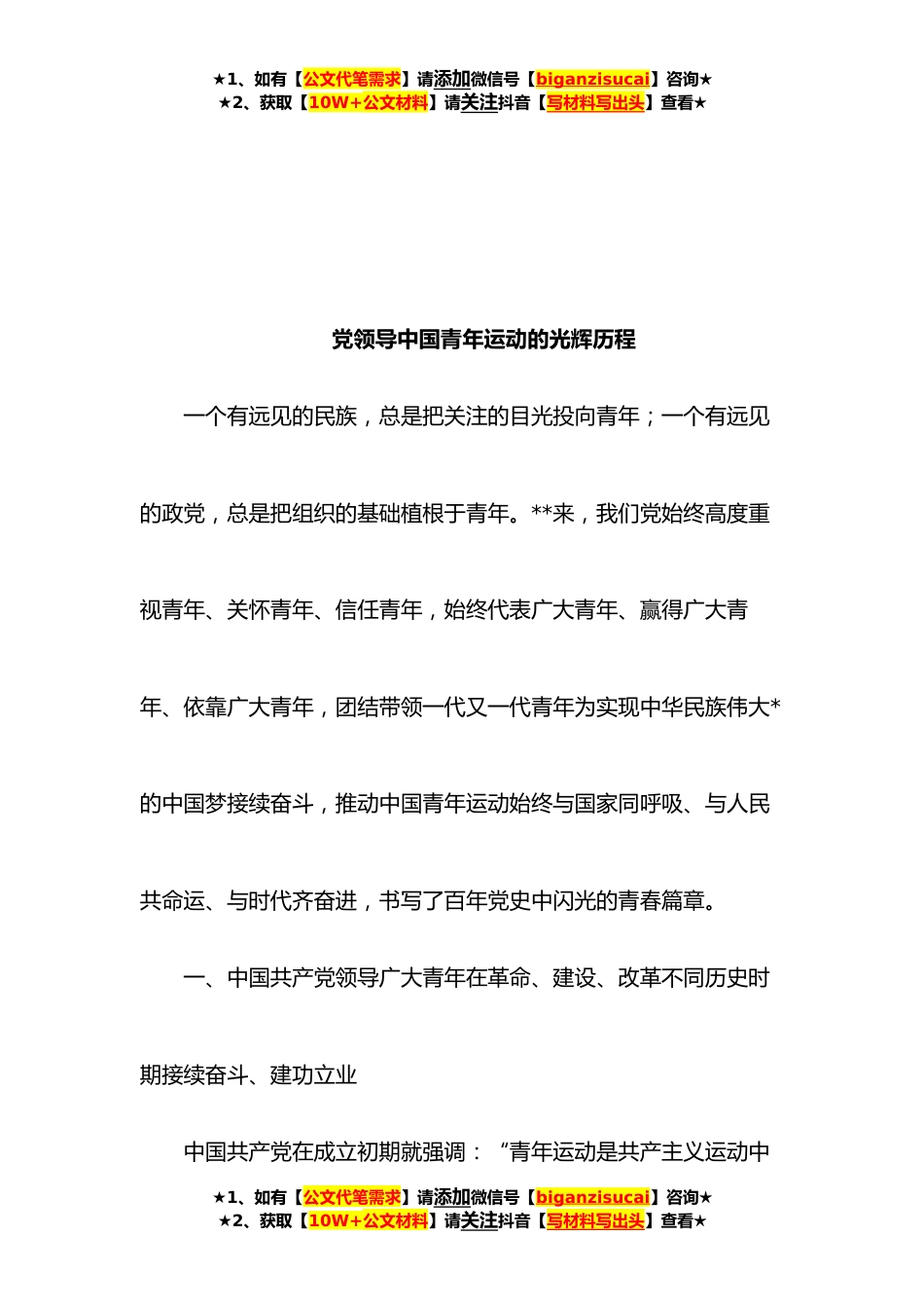 ★1、如有【公文代笔需求】请添加微信号【biganzisucai】咨询★★2、获取【10W+公文材料】请关注抖音【写材料写出头】查看★庆祝建团**年专题团课讲稿汇编(*)目录1.党领导中国青年运动的光辉历程*2.弘扬五四精神奉献青春力量*3.永远跟党走建功新时代*★1、如有【公文代笔需求】请添加微信号【biganzisucai】咨询★★2、获取【10W+公文材料】请关注抖音【写材料写出头】查看★★1、如有【公文代笔需求】请添加微信号【biganzisucai】咨询★★2、获取【10W+公文材料】请关注抖音【写材料写出头】查看★党领导中国青年运动的光辉历程一个有远见的民族,总是把关注的目光投向青年;一个有远见的政党,总是把组织的基础植根于青年。**来,我们党始终高度重视青年、关怀青年、信任青年,始终代表广大青年、赢得广大青...