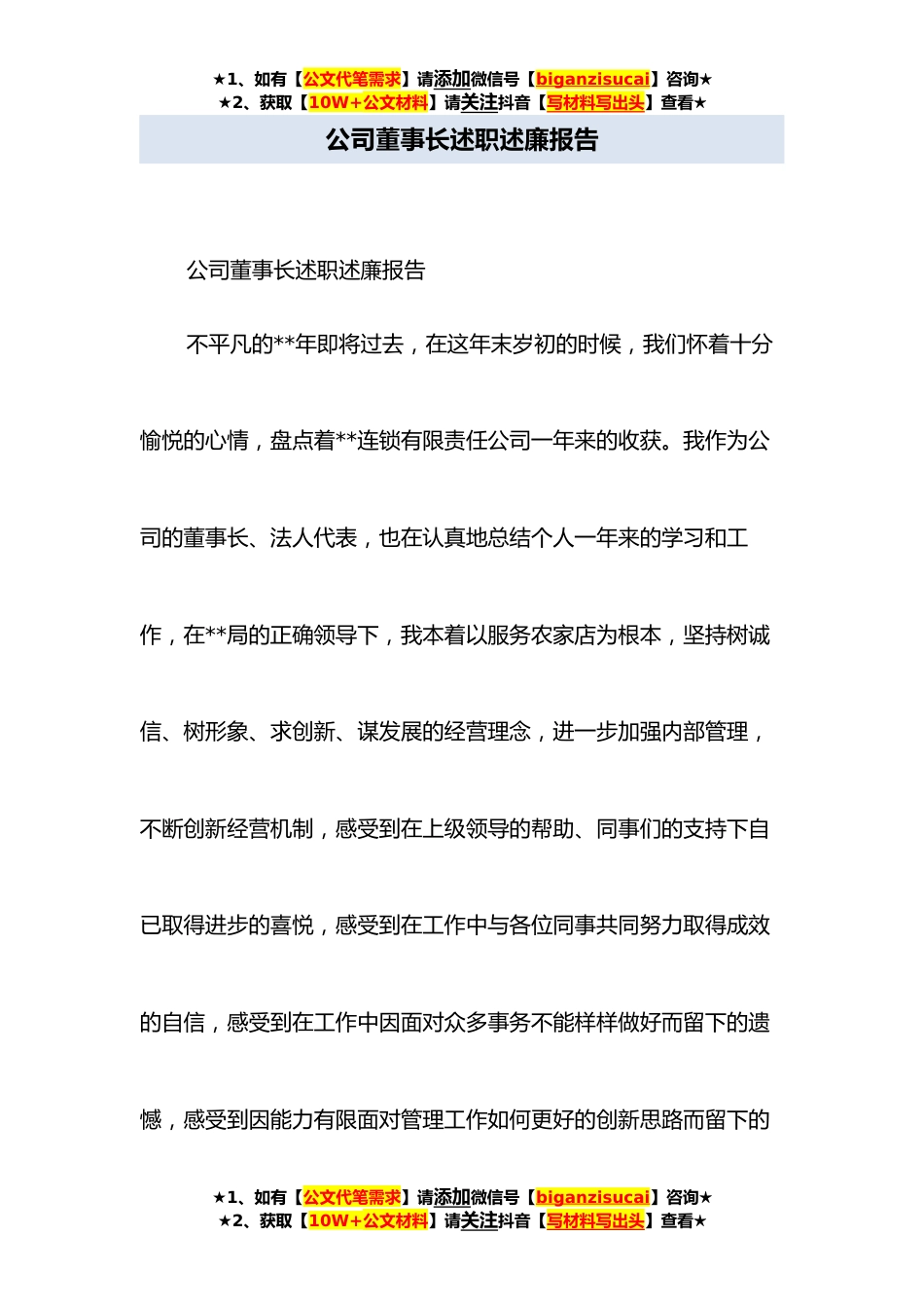 ★1、如有【公文代笔需求】请添加微信号【biganzisucai】咨询★★2、获取【10W+公文材料】请关注抖音【写材料写出头】查看★公司董事长述职述廉报告公司董事长述职述廉报告不平凡的**年即将过去,在这年末岁初的时候,我们怀着十分愉悦的心情,盘点着**连锁有限责任公司一年来的收获。我作为公司的董事长、法人代表,也在认真地总结个人一年来的学习和工作,在**局的正确领导下,我本着以服务农家店为根本,坚持树诚信、树形象、求创新、谋发展的经营理念,进一步加强内部管理,不断创新经营机制,感受到在上级领导的帮助、同事们的支持下自已取得进步的喜悦,感受到在工作中与各位同事共同努力取得成效的自信,感受到在工作中因面对众多事务不能样样做好而留下的遗憾,感受到因能力有限面对管理工作如何更好的创...