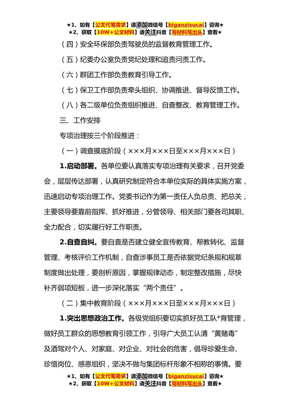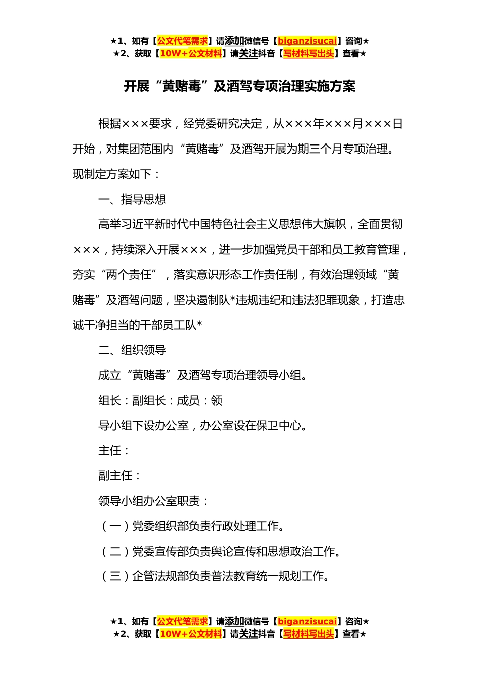 ★1、如有【公文代笔需求】请添加微信号【biganzisucai】咨询★★2、获取【10W+公文材料】请关注抖音【写材料写出头】查看★开展“黄赌毒”及酒驾专项治理实施方案根据×××要求,经党委研究决定,从×××年×××月×××日开始,对集团范围内“黄赌毒”及酒驾开展为期三个月专项治理。现制定方案如下:一、指导思想高举习近平新时代中国特色社会主义思想伟大旗帜,全面贯彻×××,持续深入开展×××,进一步加强党员干部和员工教育管理,夯实“两个责任”,落实意识形态工作责任制,有效治理领域“黄赌毒”及酒驾问题,坚决遏制队*违规违纪和违法犯罪现象,打造忠诚干净担当的干部员工队*二、组织领导成立“黄赌毒”及酒驾专项治理领导小组。组长:副组长:成员:领导小组下设办公室,办公室设在保卫中心。...