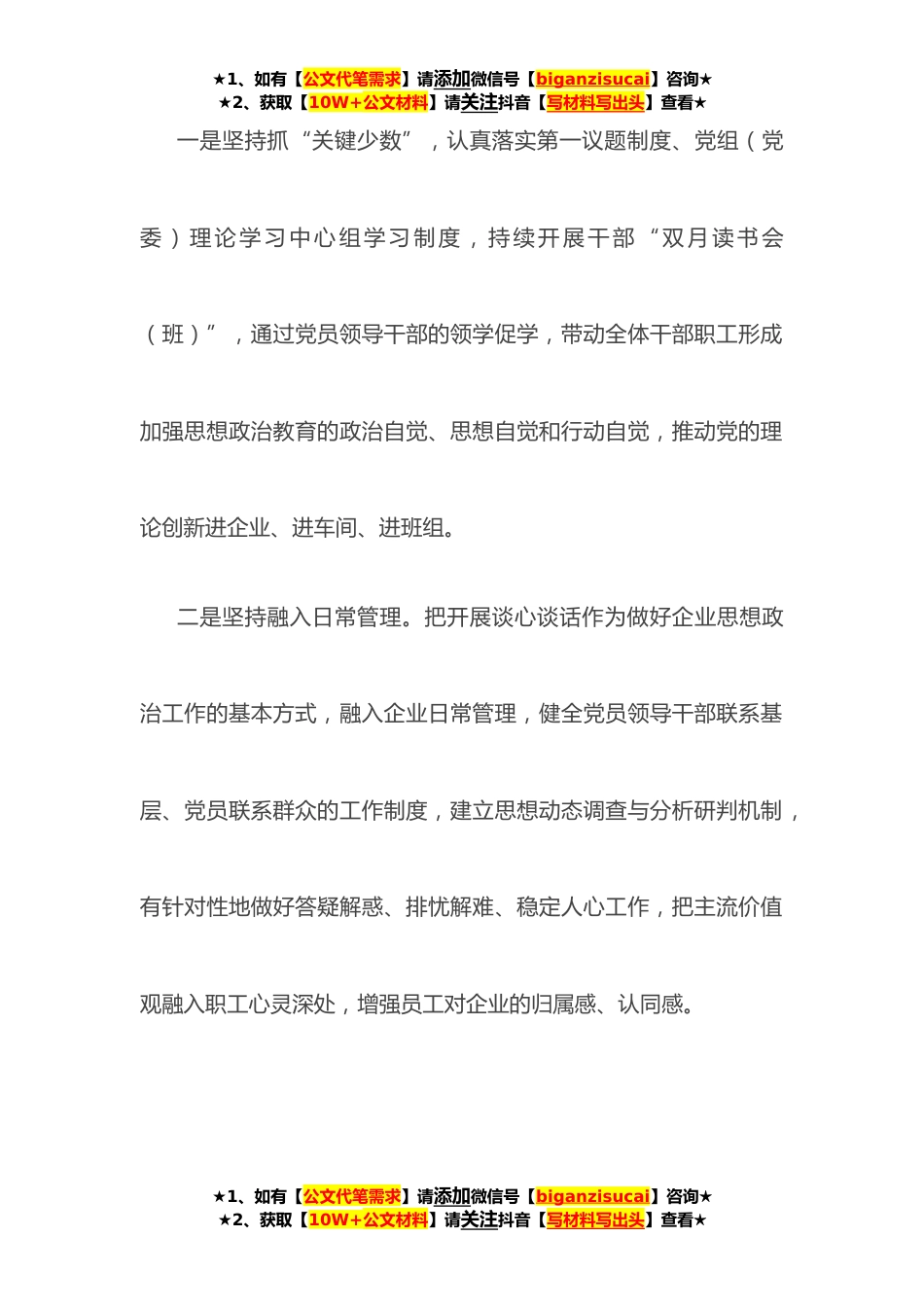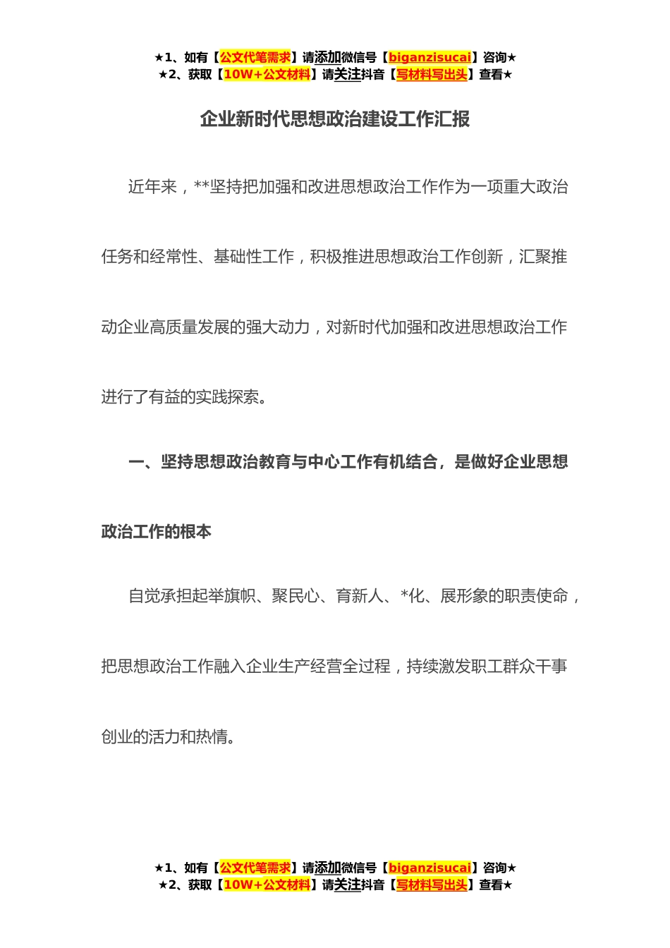 ★1、如有【公文代笔需求】请添加微信号【biganzisucai】咨询★★2、获取【10W+公文材料】请关注抖音【写材料写出头】查看★企业新时代思想政治建设工作汇报近年来,**坚持把加强和改进思想政治工作作为一项重大政治任务和经常性、基础性工作,积极推进思想政治工作创新,汇聚推动企业高质量发展的强大动力,对新时代加强和改进思想政治工作进行了有益的实践探索。一、坚持思想政治教育与中心工作有机结合,是做好企业思想政治工作的根本自觉承担起举旗帜、聚民心、育新人、*化、展形象的职责使命,把思想政治工作融入企业生产经营全过程,持续激发职工群众干事创业的活力和热情。★1、如有【公文代笔需求】请添加微信号【biganzisucai】咨询★★2、获取【10W+公文材料】请关注抖音【写材料写出头】查看★★1、如...