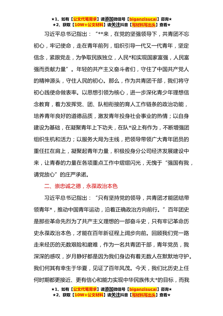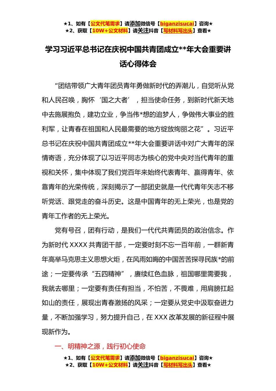 ★1、如有【公文代笔需求】请添加微信号【biganzisucai】咨询★★2、获取【10W+公文材料】请关注抖音【写材料写出头】查看★学习习近平总书记在庆祝中国共青团成立**年大会重要讲话心得体会“团结带领广大青年团员青年勇做新时代的弄潮儿,自觉听从党和人民召唤,胸怀‘国之大者’,担当使命任务,到新时代新天地中去施展抱负,建功立业,争当伟*想的追梦人,争做伟大事业的胜利军,让青春在祖国和人民最需要的地方绽放绚丽之花”。习近平总书记在庆祝中国共青团成立**年大会重要讲话中对广大青年的深情寄语,充分体现了以习近平同志为核心的党中央对当代青年的重视和关怀,集中体现了我们党百年来始终代表青年、赢得青年、依靠青年的光荣传统,深刻揭示了一部团史就是一代代青年矢志不移听党话、跟党走的奋斗历史...