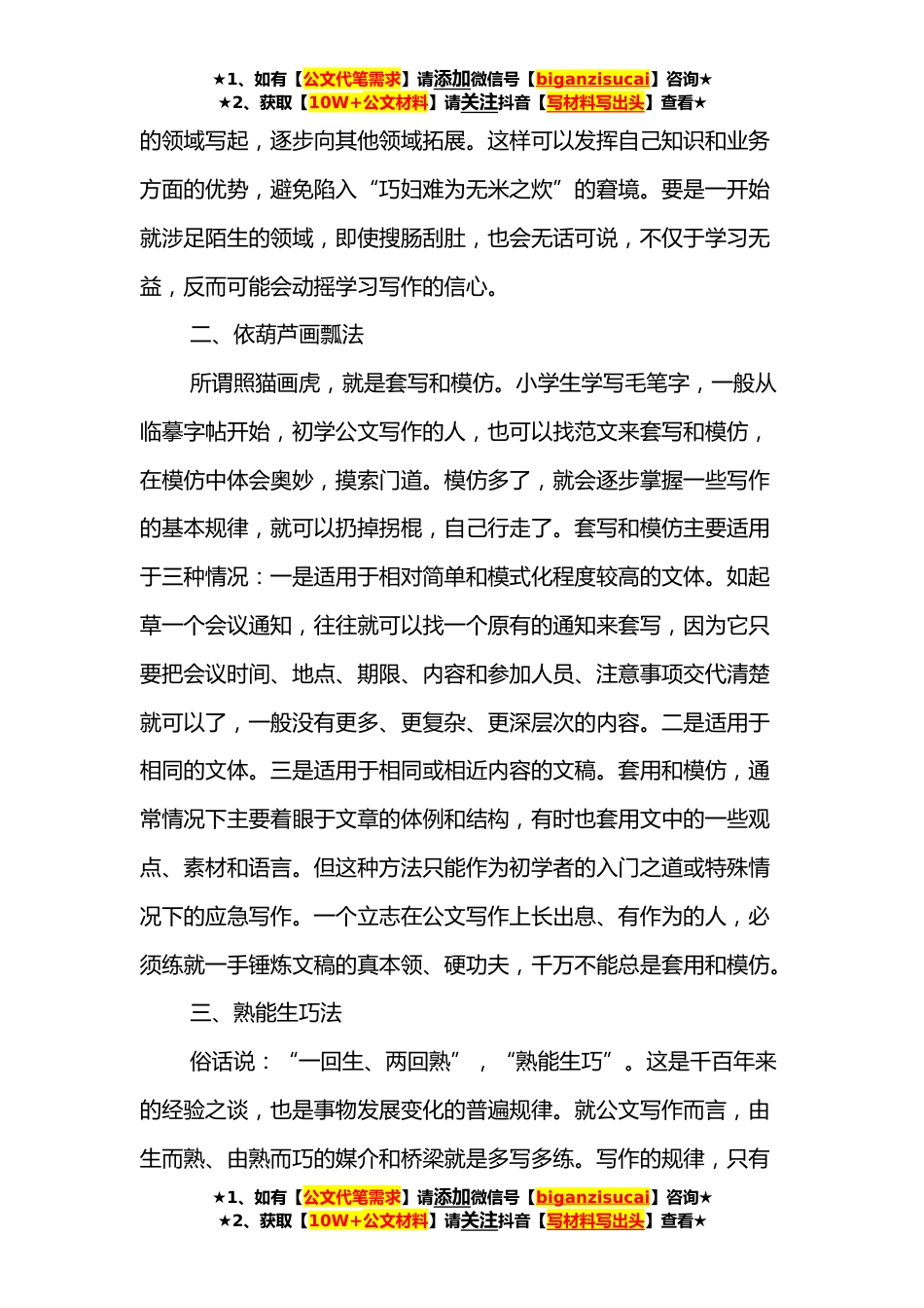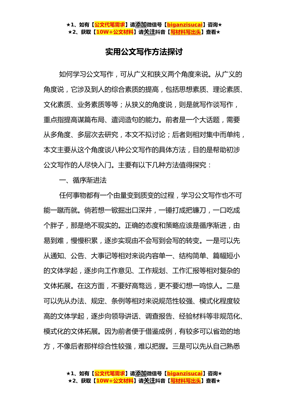 ★1、如有【公文代笔需求】请添加微信号【biganzisucai】咨询★★2、获取【10W+公文材料】请关注抖音【写材料写出头】查看★实用公文写作方法探讨如何学习公文写作,可从广义和狭义两个角度来说。从广义的角度说,它涉及到人的综合素质的提高,包括思想素质、理论素质、文化素质、业务素质等等;从狭义的角度说,则是就写作谈写作,重点指提高谋篇布局、遣词造句的能力。前者是一个大话题,需要从多角度、多层次去研究,本文不拟讨论;后者则相对集中而单纯,本文主要从这个角度谈八种公文写作的具体方法,目的是帮助初涉公文写作的人尽快入门。主要有以下几种方法值得探究:一、循序渐进法任何事物都有一个由量变到质变的过程,学习公文写作也不可能一蹴而就。倘若想一锨掘出口深井,一锤打成把镰刀,一口吃成个...