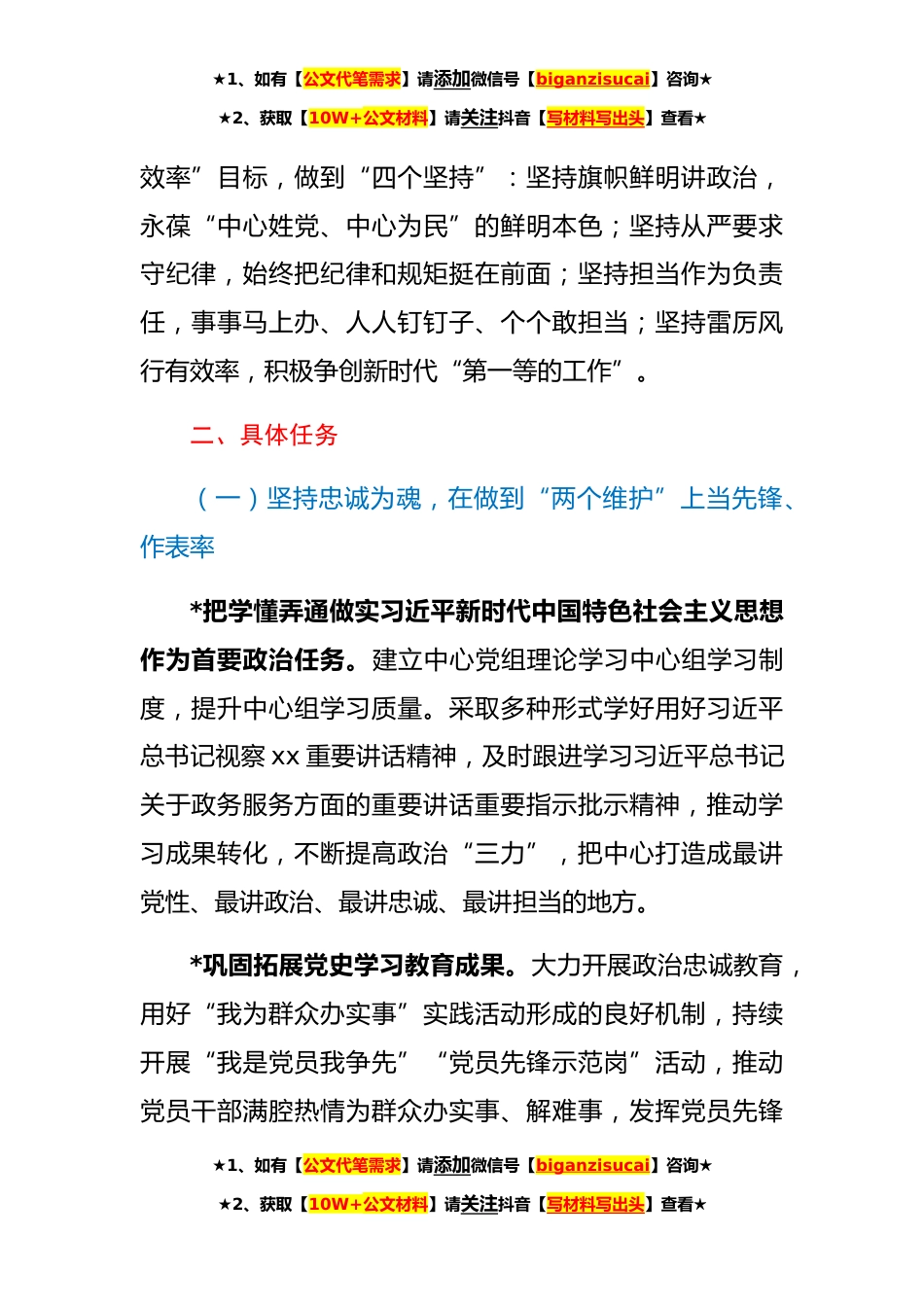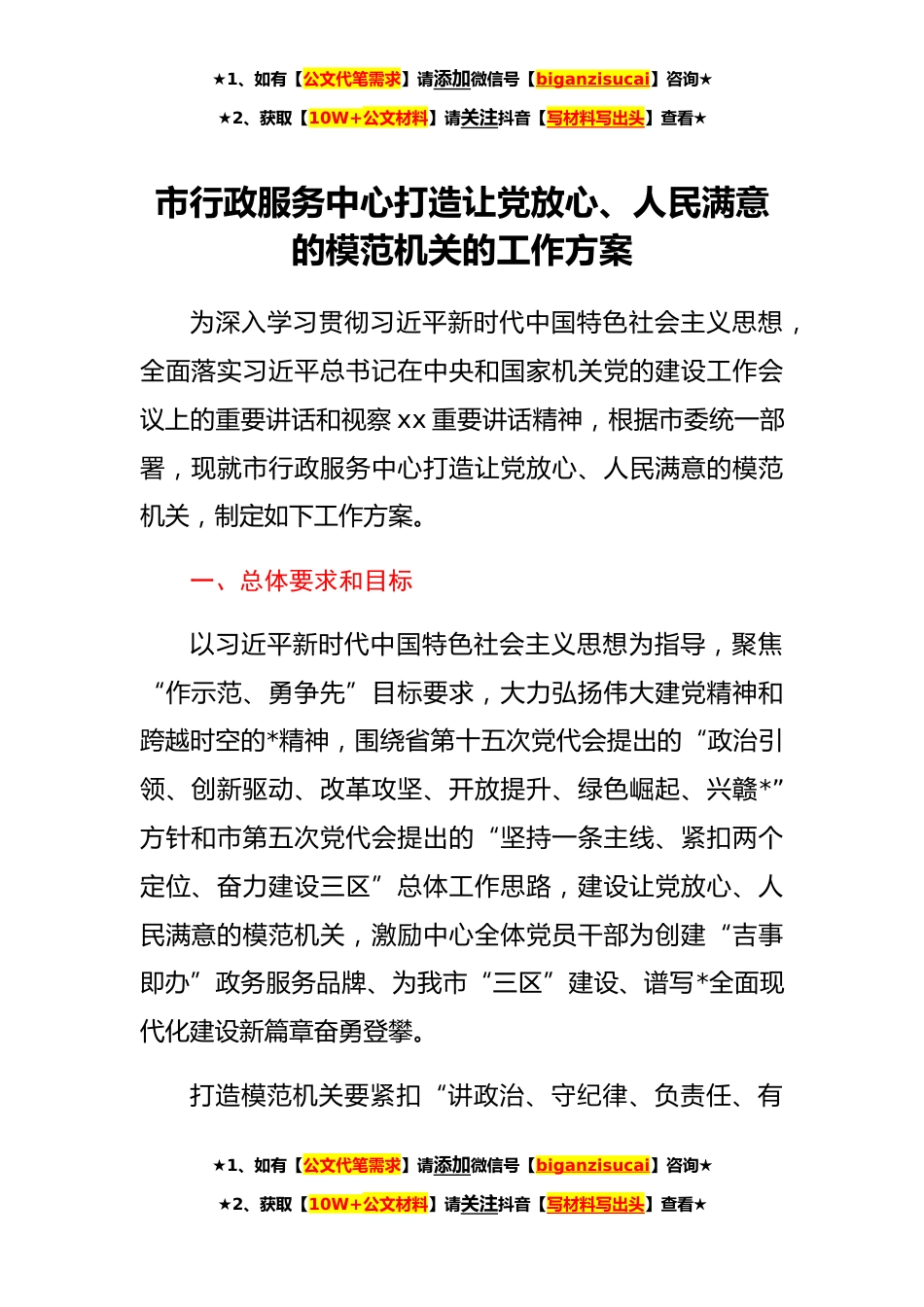 ★1、如有【公文代笔需求】请添加微信号【biganzisucai】咨询★★2、获取【10W+公文材料】请关注抖音【写材料写出头】查看★市行政服务中心打造让党放心、人民满意的模范机关的工作方案为深入学习贯彻习近平新时代中国特色社会主义思想,全面落实习近平总书记在中央和国家机关党的建设工作会议上的重要讲话和视察xx重要讲话精神,根据市委统一部署,现就市行政服务中心打造让党放心、人民满意的模范机关,制定如下工作方案。一、总体要求和目标以习近平新时代中国特色社会主义思想为指导,聚焦“作示范、勇争先”目标要求,大力弘扬伟大建党精神和跨越时空的*精神,围绕省第十五次党代会提出的“政治引领、创新驱动、改革攻坚、开放提升、绿色崛起、兴赣*”方针和市第五次党代会提出的“坚持一条主线、紧扣两个定...