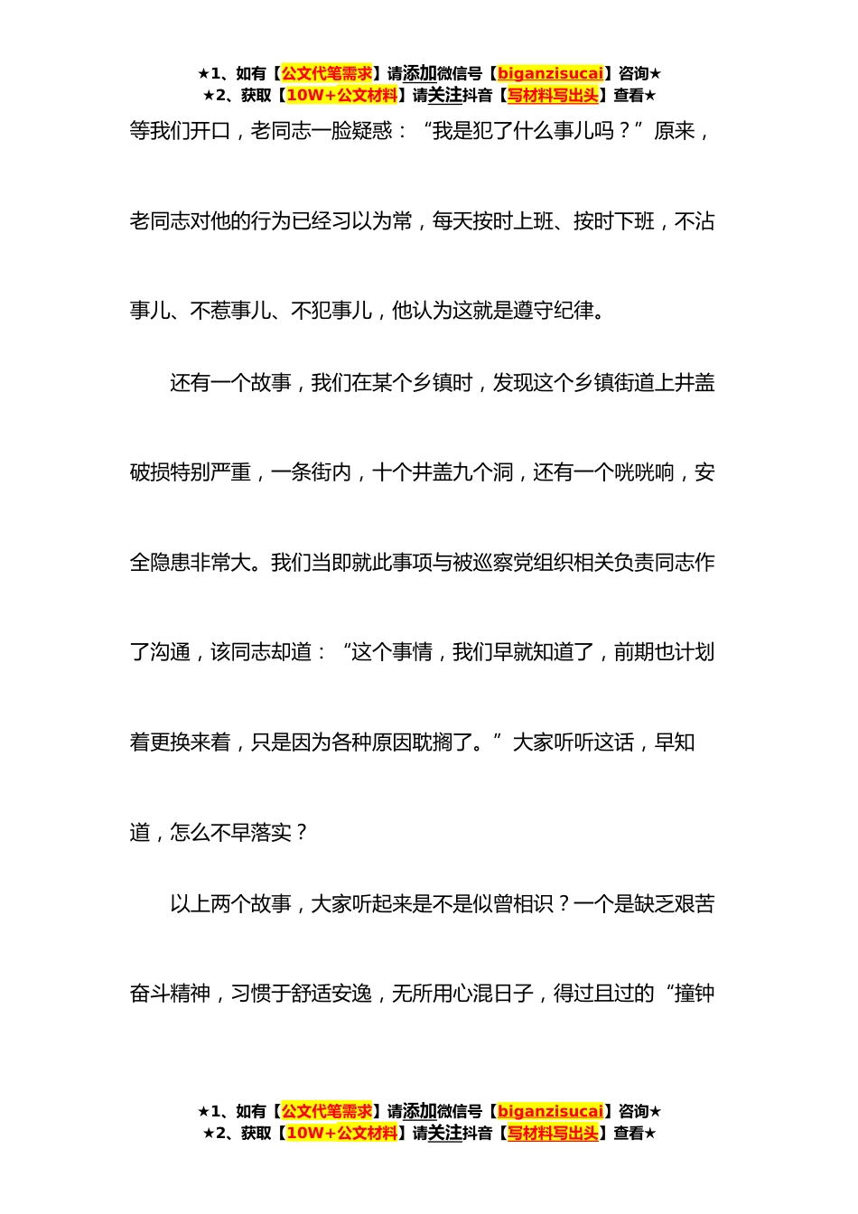 ★1、如有【公文代笔需求】请添加微信号【biganzisucai】咨询★★2、获取【10W+公文材料】请关注抖音【写材料写出头】查看★巡察办干部喜迎二十大主题演讲稿:革除思想积弊锤炼实干作风大家好!我是区委巡察办XXX,我演讲的题目是《革除思想积弊锤炼实干作风》。大家都知道我是干巡察工作的,这里先给大家分享两个巡察小故事。我们进驻一家单位的第一天,上班时间,我们对面办公室一名老同志就在那里嗦泡面,当时正是脱贫攻坚最艰难、最繁忙的时期,这个时间没吃早餐也是常有的事。结果第二天,老同志戴着老花镜在那儿刷手机,气若神闲,第三天,边啃包子边刷手机,第四天、第五天……如此往复。于是,我们就“请”了这位老同志,还没★1、如有【公文代笔需求】请添加微信号【biganzisucai】咨询★★2、获取【10W+...