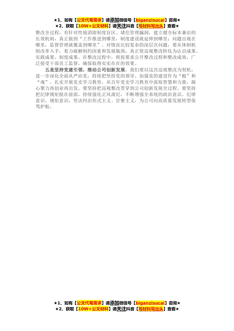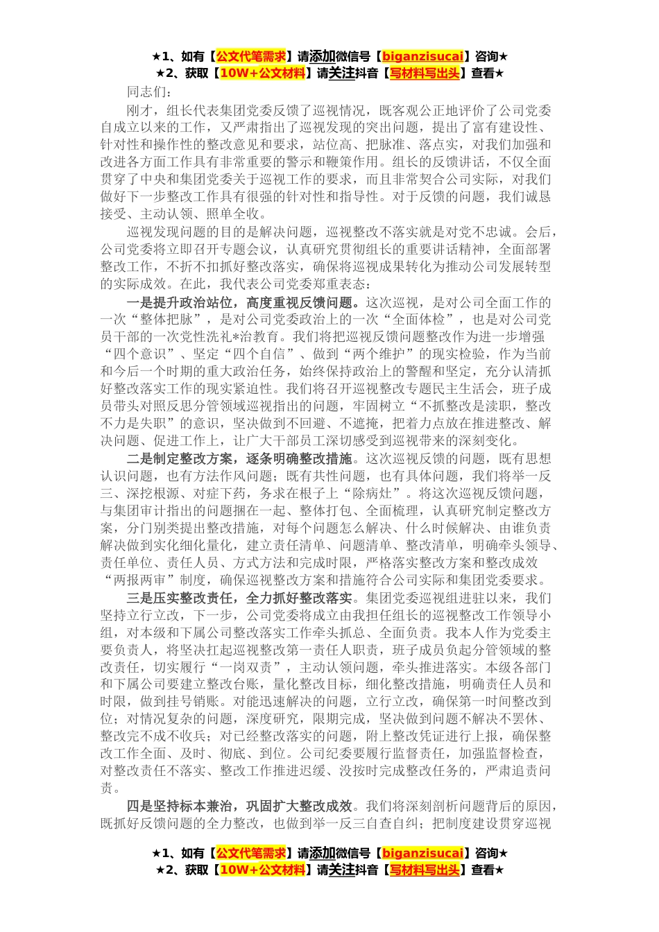 ★1、如有【公文代笔需求】请添加微信号【biganzisucai】咨询★★2、获取【10W+公文材料】请关注抖音【写材料写出头】查看★同志们:刚才,组长代表集团党委反馈了巡视情况,既客观公正地评价了公司党委自成立以来的工作,又严肃指出了巡视发现的突出问题,提出了富有建设性、针对性和操作性的整改意见和要求,站位高、把脉准、落点实,对我们加强和改进各方面工作具有非常重要的警示和鞭策作用。组长的反馈讲话,不仅全面贯穿了中央和集团党委关于巡视工作的要求,而且非常契合公司实际,对我们做好下一步整改工作具有很强的针对性和指导性。对于反馈的问题,我们诚恳接受、主动认领、照单全收。巡视发现问题的目的是解决问题,巡视整改不落实就是对党不忠诚。会后,公司党委将立即召开专题会议,认真研究贯彻组...