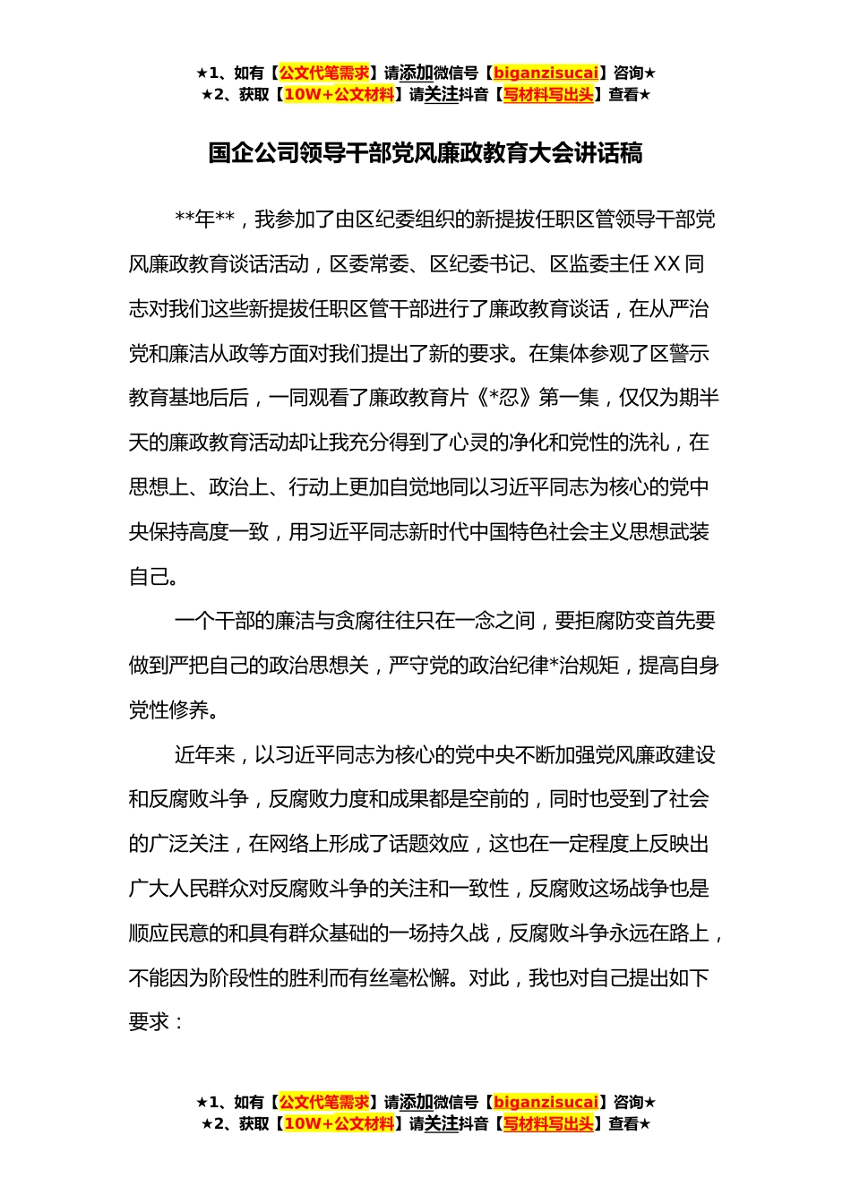 ★1、如有【公文代笔需求】请添加微信号【biganzisucai】咨询★★2、获取【10W+公文材料】请关注抖音【写材料写出头】查看★国企公司领导干部党风廉政教育大会讲话稿**年**,我参加了由区纪委组织的新提拔任职区管领导干部党风廉政教育谈话活动,区委常委、区纪委书记、区监委主任XX同志对我们这些新提拔任职区管干部进行了廉政教育谈话,在从严治党和廉洁从政等方面对我们提出了新的要求。在集体参观了区警示教育基地后后,一同观看了廉政教育片《*忍》第一集,仅仅为期半天的廉政教育活动却让我充分得到了心灵的净化和党性的洗礼,在思想上、政治上、行动上更加自觉地同以习近平同志为核心的党中央保持高度一致,用习近平同志新时代中国特色社会主义思想武装自己。一个干部的廉洁与贪腐往往只在一念之间,要拒腐...