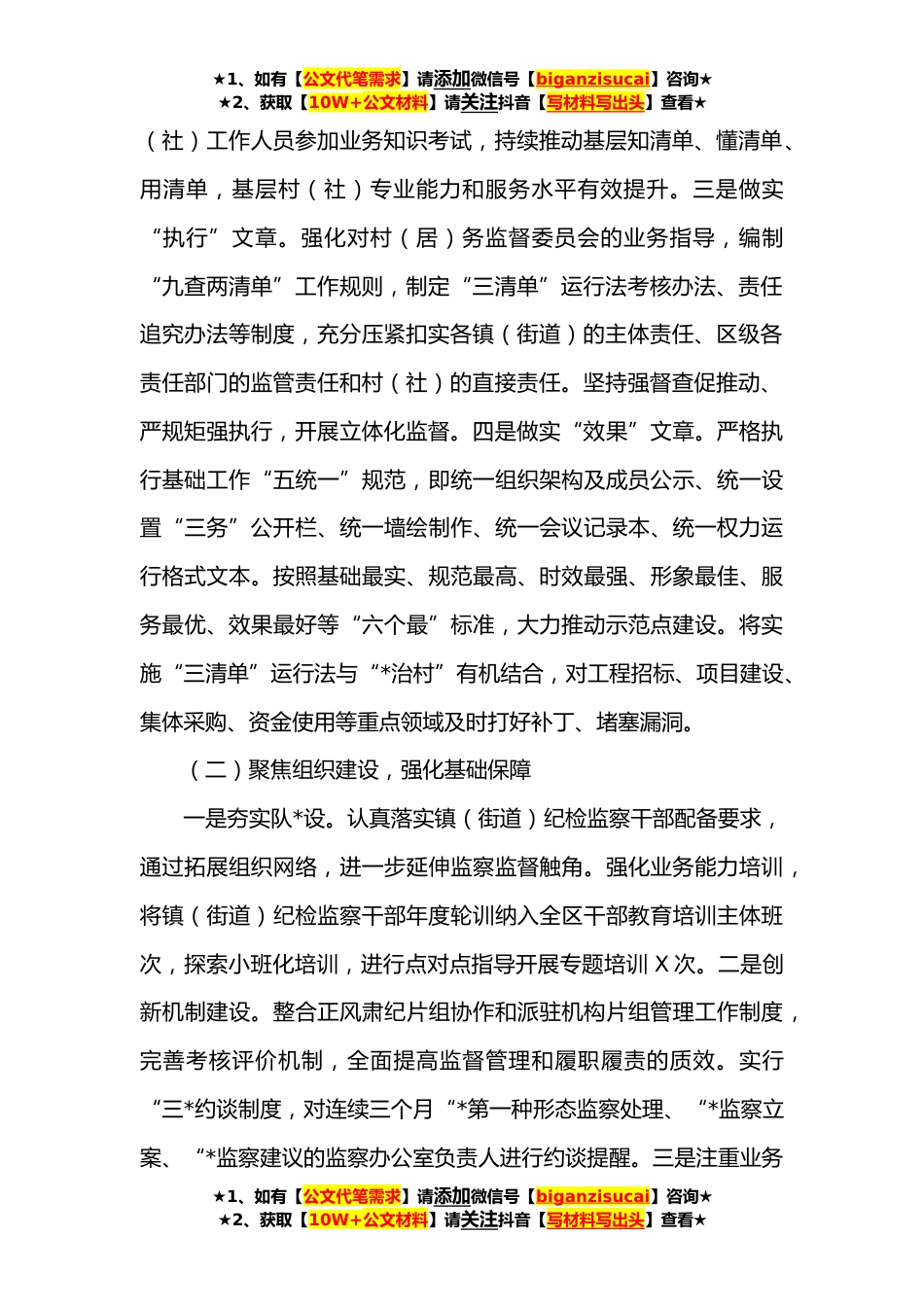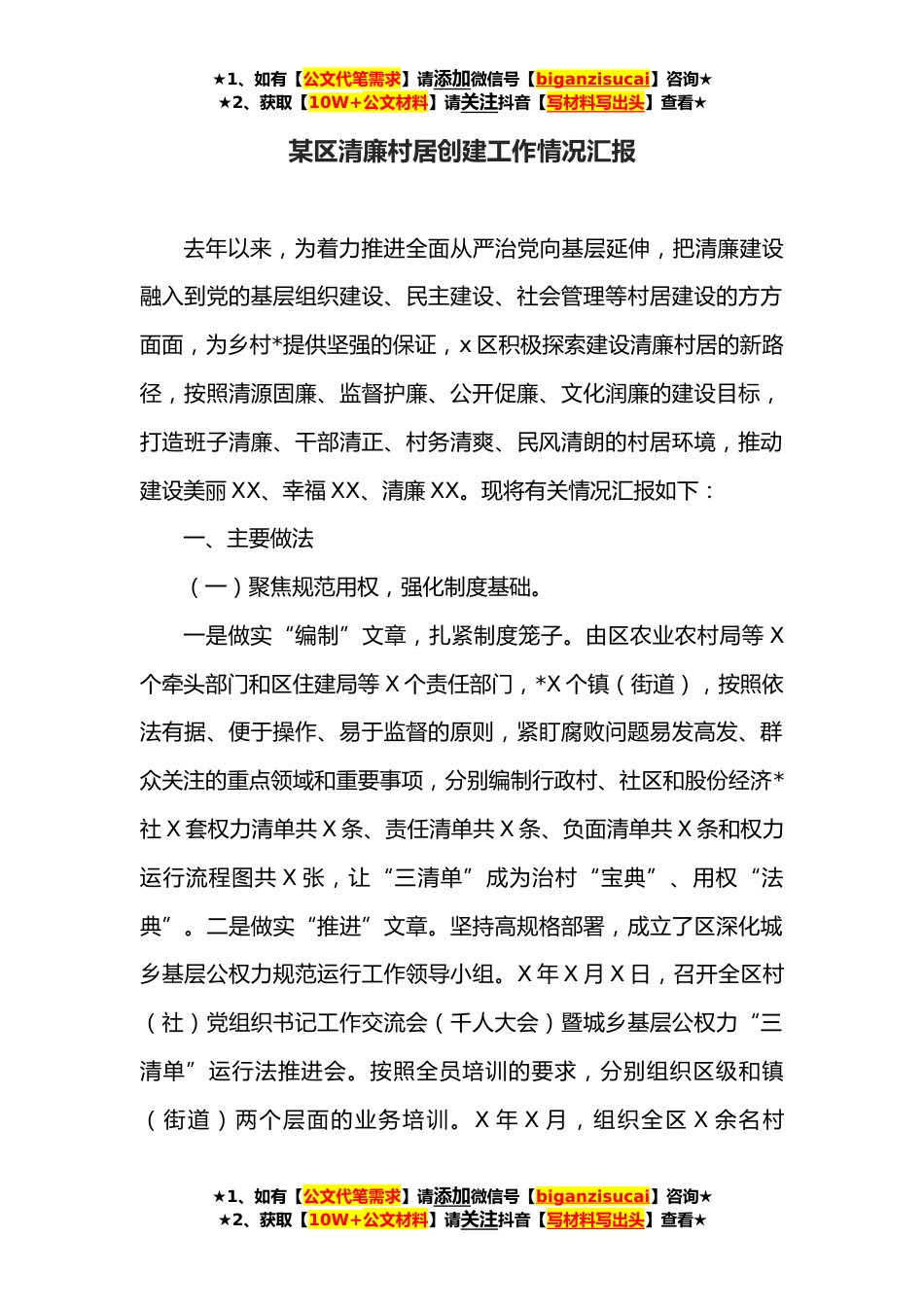★1、如有【公文代笔需求】请添加微信号【biganzisucai】咨询★★2、获取【10W+公文材料】请关注抖音【写材料写出头】查看★某区清廉村居创建工作情况汇报去年以来,为着力推进全面从严治党向基层延伸,把清廉建设融入到党的基层组织建设、民主建设、社会管理等村居建设的方方面面,为乡村*提供坚强的保证,x区积极探索建设清廉村居的新路径,按照清源固廉、监督护廉、公开促廉、文化润廉的建设目标,打造班子清廉、干部清正、村务清爽、民风清朗的村居环境,推动建设美丽XX、幸福XX、清廉XX。现将有关情况汇报如下:一、主要做法(一)聚焦规范用权,强化制度基础。一是做实“编制”文章,扎紧制度笼子。由区农业农村局等X个牵头部门和区住建局等X个责任部门,*X个镇(街道),按照依法有据、便于操作、易于监督...