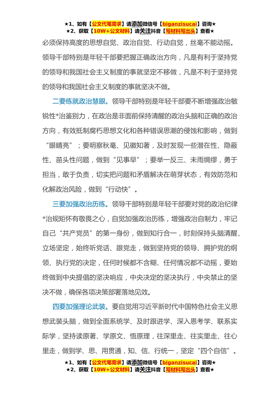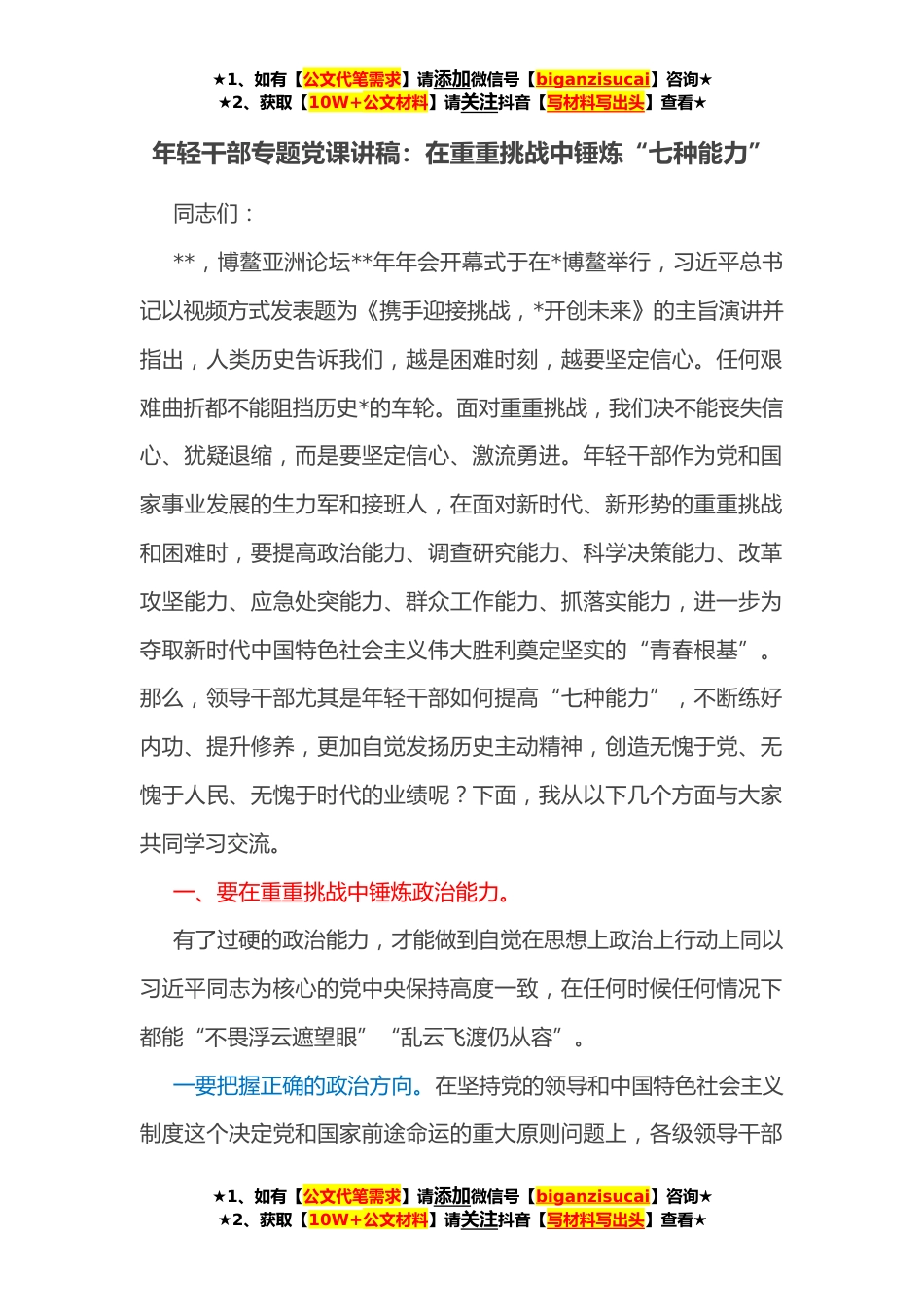 ★1、如有【公文代笔需求】请添加微信号【biganzisucai】咨询★★2、获取【10W+公文材料】请关注抖音【写材料写出头】查看★年轻干部专题党课讲稿:在重重挑战中锤炼“七种能力”同志们:**,博鳌亚洲论坛**年年会开幕式于在*博鳌举行,习近平总书记以视频方式发表题为《携手迎接挑战,*开创未来》的主旨演讲并指出,人类历史告诉我们,越是困难时刻,越要坚定信心。任何艰难曲折都不能阻挡历史*的车轮。面对重重挑战,我们决不能丧失信心、犹疑退缩,而是要坚定信心、激流勇进。年轻干部作为党和国家事业发展的生力军和接班人,在面对新时代、新形势的重重挑战和困难时,要提高政治能力、调查研究能力、科学决策能力、改革攻坚能力、应急处突能力、群众工作能力、抓落实能力,进一步为夺取新时代中国特色社会主义...