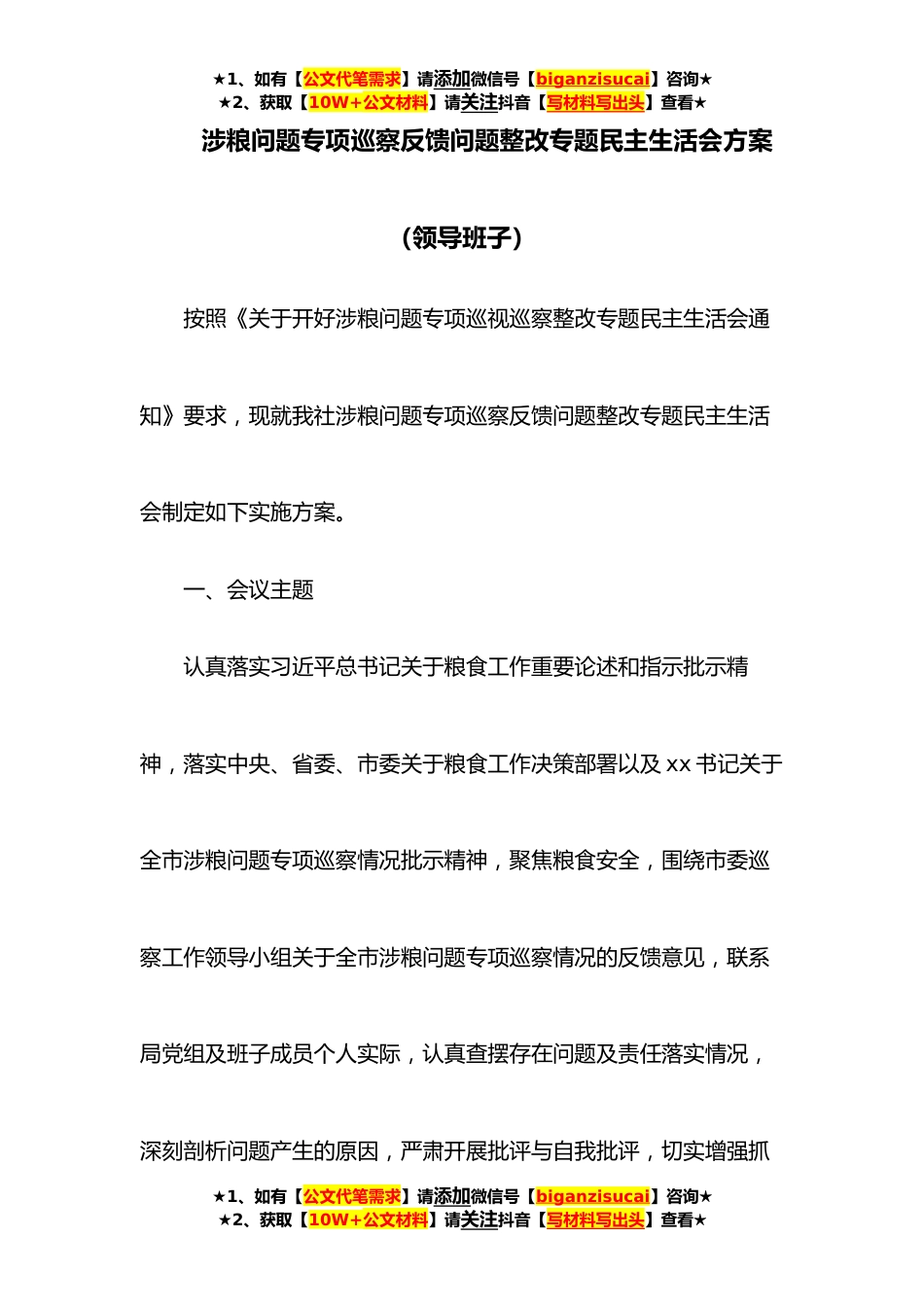 ★1、如有【公文代笔需求】请添加微信号【biganzisucai】咨询★★2、获取【10W+公文材料】请关注抖音【写材料写出头】查看★涉粮问题专项巡察反馈问题整改专题民主生活会方案(领导班子)按照《关于开好涉粮问题专项巡视巡察整改专题民主生活会通知》要求,现就我社涉粮问题专项巡察反馈问题整改专题民主生活会制定如下实施方案。一、会议主题认真落实习近平总书记关于粮食工作重要论述和指示批示精神,落实中央、省委、市委关于粮食工作决策部署以及xx书记关于全市涉粮问题专项巡察情况批示精神,聚焦粮食安全,围绕市委巡察工作领导小组关于全市涉粮问题专项巡察情况的反馈意见,联系局党组及班子成员个人实际,认真查摆存在问题及责任落实情况,深刻剖析问题产生的原因,严肃开展批评与自我批评,切实增强抓★1...