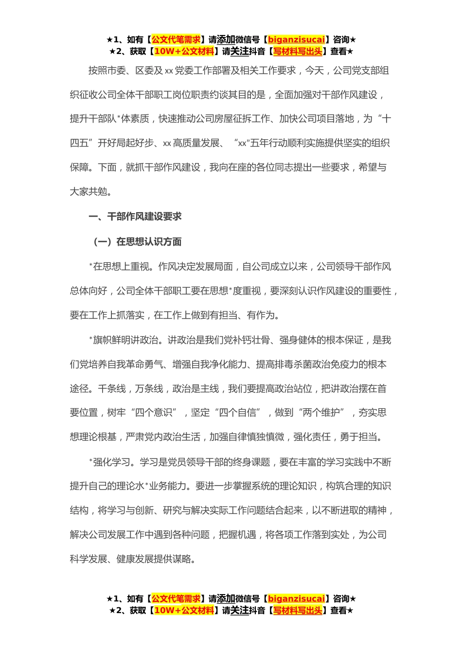 ★1、如有【公文代笔需求】请添加微信号【biganzisucai】咨询★★2、获取【10W+公文材料】请关注抖音【写材料写出头】查看★按照市委、区委及xx党委工作部署及相关工作要求,今天,公司党支部组织征收公司全体干部职工岗位职责约谈其目的是,全面加强对干部作风建设,提升干部队*体素质,快速推动公司房屋征拆工作、加快公司项目落地,为“十四五”开好局起好步、xx高质量发展、“xx”五年行动顺利实施提供坚实的组织保障。下面,就抓干部作风建设,我向在座的各位同志提出一些要求,希望与大家共勉。一、干部作风建设要求(一)在思想认识方面*在思想上重视。作风决定发展局面,自公司成立以来,公司领导干部作风总体向好,公司全体干部职工要在思想*度重视,要深刻认识作风建设的重要性,要在工作上抓落实,在工...