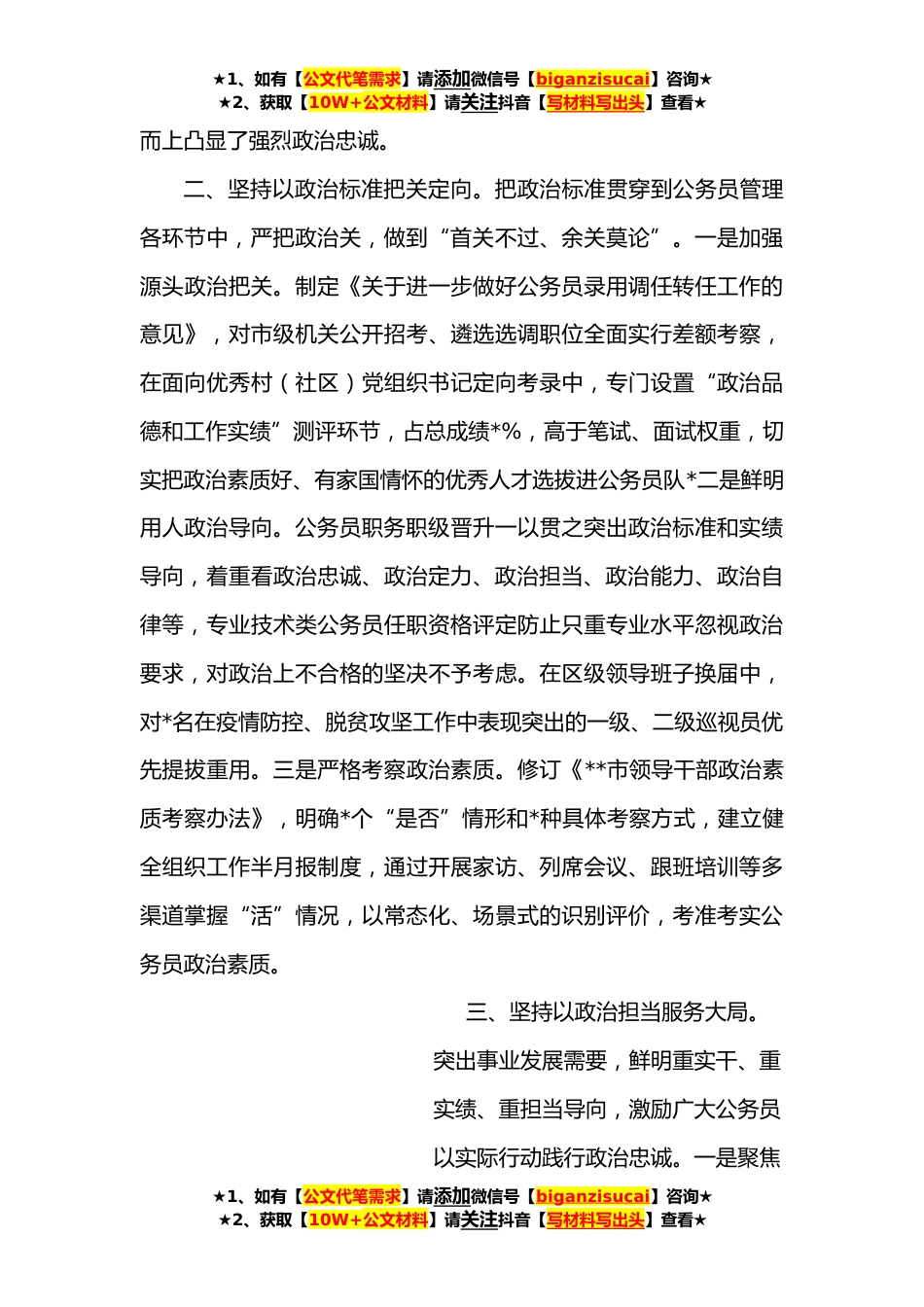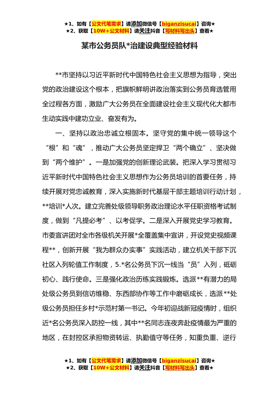 ★1、如有【公文代笔需求】请添加微信号【biganzisucai】咨询★★2、获取【10W+公文材料】请关注抖音【写材料写出头】查看★某市公务员队*治建设典型经验材料**市坚持以习近平新时代中国特色社会主义思想为指导,突出党的政治建设这个根本,把旗帜鲜明讲政治落实到公务员育选管用全过程各方面,激励广大公务员在全面建设社会主义现代化大都市生动实践中建功立业、奋发有为。一、坚持以政治忠诚立根固本。坚守党的集中统一领导这个“根”和“魂”,推动广大公务员坚定捍卫“两个确立”、坚决做到“两个维护”。一是加强党的创新理论武装。把深入学习贯彻习近平新时代中国特色社会主义思想作为公务员培训的首要任务,持续开展对党忠诚教育,深入实施新时代基层干部主题培训行动计划,**培训*人次。建立完善处级领导...