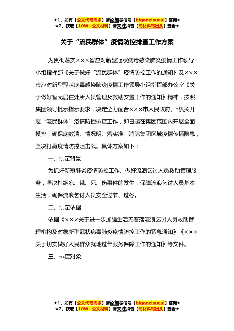 ★1、如有【公文代笔需求】请添加微信号【biganzisucai】咨询★★2、获取【10W+公文材料】请关注抖音【写材料写出头】查看★关于“流民群体”疫情防控排查工作方案为贯彻落实×××省应对新型冠状病毒感染肺炎疫情工作领导小组指挥部《关于做好“流民群体”疫情防控工作的通知》及×××市应对新型冠状病毒感染肺炎疫情工作领导小组指挥部办公室《关于做好暂无居住处所人员管理及救助安置工作的通知》精神,按照集团领导批示指示要求,决定全力配合×××市人民政府、*机关开展“流民群体”疫情防控排查工作,即日起在集团范围内开展全面摸排,确保底数清、情况明、落实准,消除集团区域疫情传播隐患,坚决打赢疫情防控阻击战。具体方案如下:一、制定背景为抓好新冠肺炎疫情防控工作、做好流浪乞讨人员救助管理服...