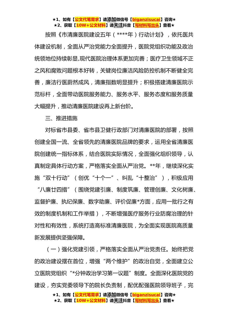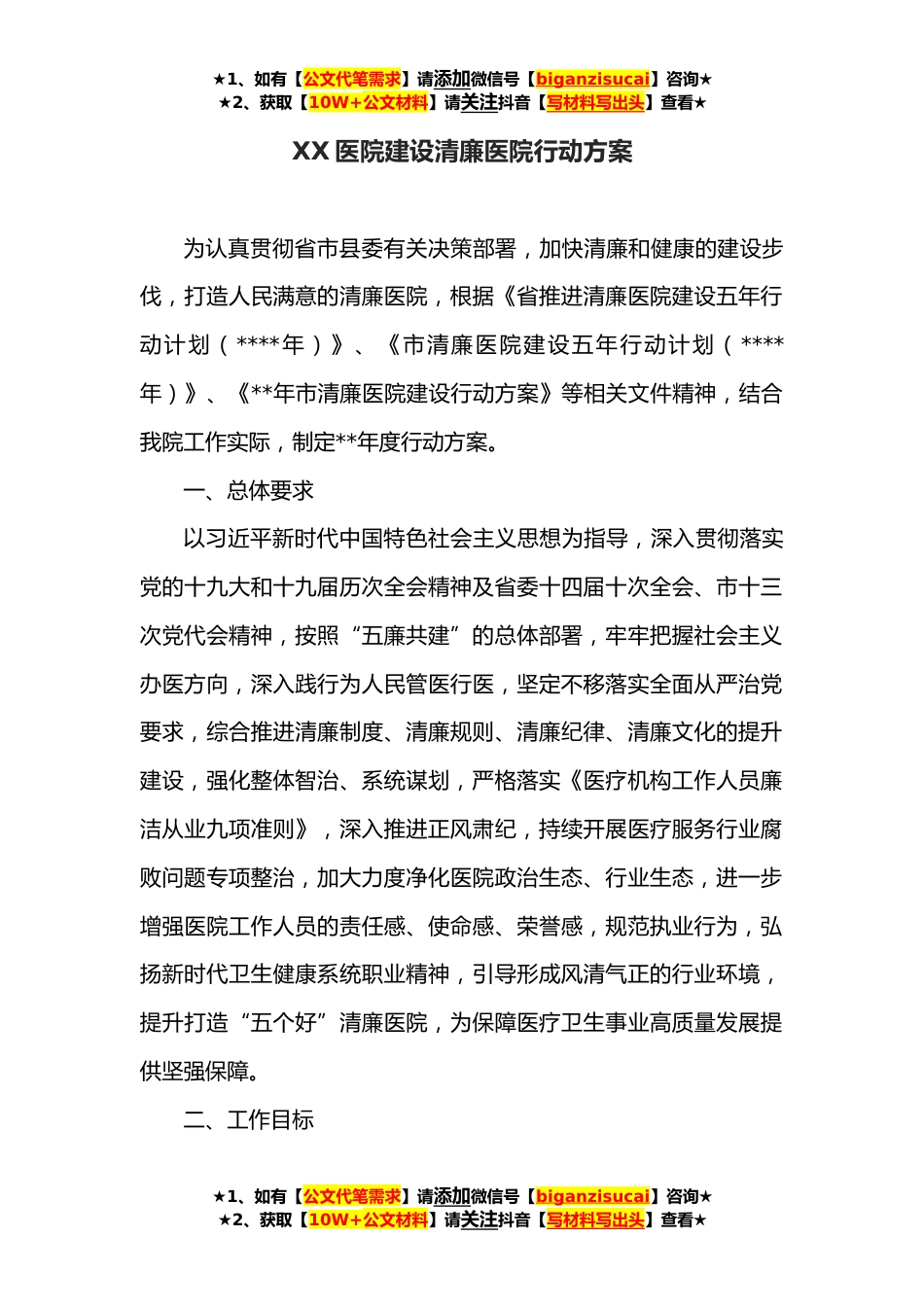 ★1、如有【公文代笔需求】请添加微信号【biganzisucai】咨询★★2、获取【10W+公文材料】请关注抖音【写材料写出头】查看★XX医院建设清廉医院行动方案为认真贯彻省市县委有关决策部署,加快清廉和健康的建设步伐,打造人民满意的清廉医院,根据《省推进清廉医院建设五年行动计划(****年)》、《市清廉医院建设五年行动计划(****年)》、《**年市清廉医院建设行动方案》等相关文件精神,结合我院工作实际,制定**年度行动方案。一、总体要求以习近平新时代中国特色社会主义思想为指导,深入贯彻落实党的十九大和十九届历次全会精神及省委十四届十次全会、市十三次党代会精神,按照“五廉共建”的总体部署,牢牢把握社会主义办医方向,深入践行为人民管医行医,坚定不移落实全面从严治党要求,综合推进清廉制度...