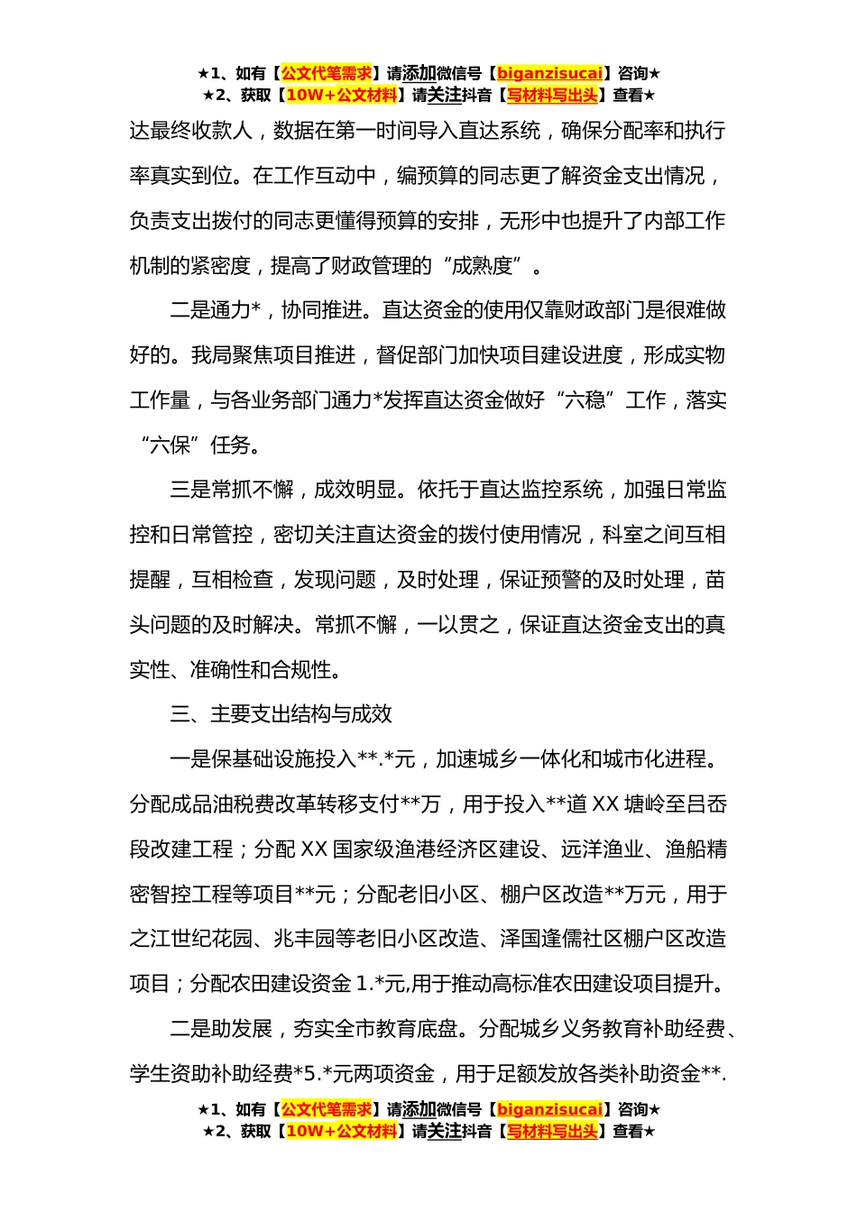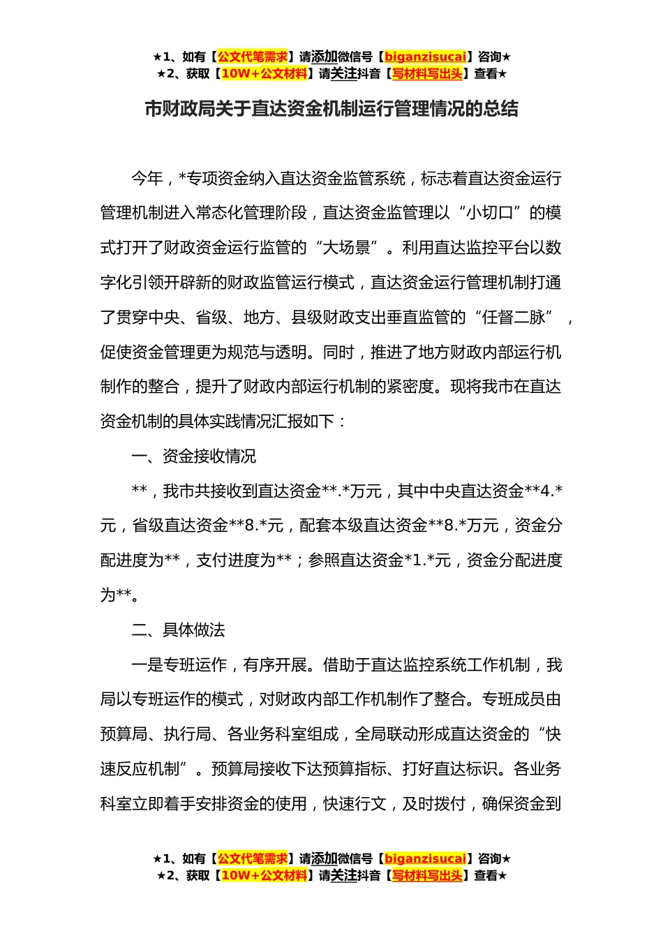 ★1、如有【公文代笔需求】请添加微信号【biganzisucai】咨询★★2、获取【10W+公文材料】请关注抖音【写材料写出头】查看★市财政局关于直达资金机制运行管理情况的总结今年,*专项资金纳入直达资金监管系统,标志着直达资金运行管理机制进入常态化管理阶段,直达资金监管理以“小切口”的模式打开了财政资金运行监管的“大场景”。利用直达监控平台以数字化引领开辟新的财政监管运行模式,直达资金运行管理机制打通了贯穿中央、省级、地方、县级财政支出垂直监管的“任督二脉”,促使资金管理更为规范与透明。同时,推进了地方财政内部运行机制作的整合,提升了财政内部运行机制的紧密度。现将我市在直达资金机制的具体实践情况汇报如下:一、资金接收情况**,我市共接收到直达资金**.*万元,其中中央直达资金**...