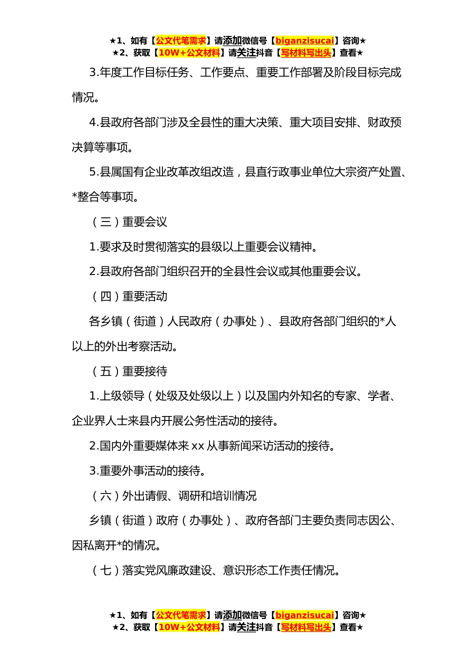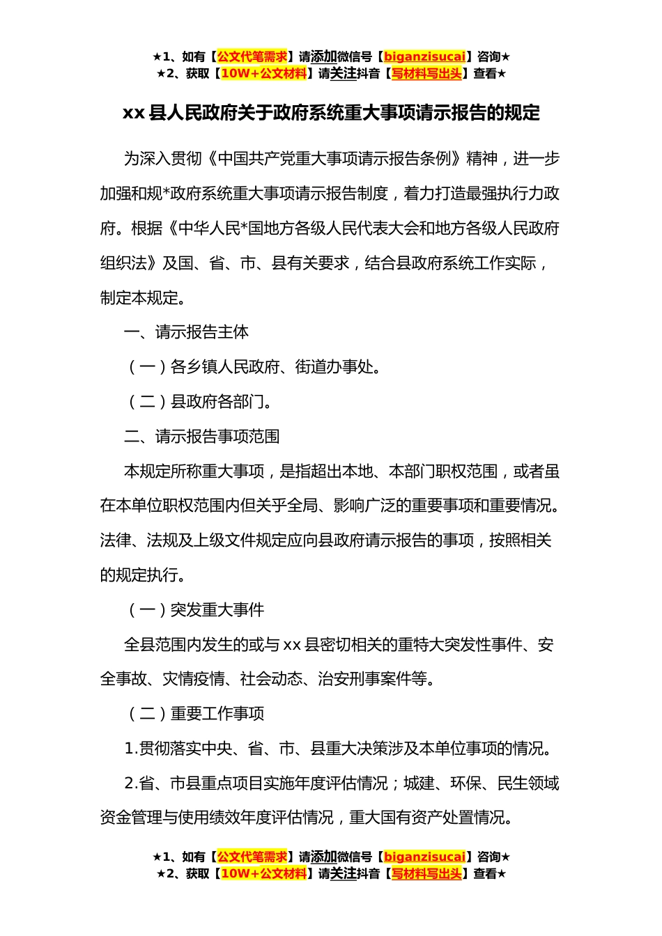 ★1、如有【公文代笔需求】请添加微信号【biganzisucai】咨询★★2、获取【10W+公文材料】请关注抖音【写材料写出头】查看★xx县人民政府关于政府系统重大事项请示报告的规定为深入贯彻《中国共产党重大事项请示报告条例》精神,进一步加强和规*政府系统重大事项请示报告制度,着力打造最强执行力政府。根据《中华人民*国地方各级人民代表大会和地方各级人民政府组织法》及国、省、市、县有关要求,结合县政府系统工作实际,制定本规定。一、请示报告主体(一)各乡镇人民政府、街道办事处。(二)县政府各部门。二、请示报告事项范围本规定所称重大事项,是指超出本地、本部门职权范围,或者虽在本单位职权范围内但关乎全局、影响广泛的重要事项和重要情况。法律、法规及上级文件规定应向县政府请示报告的事项,...