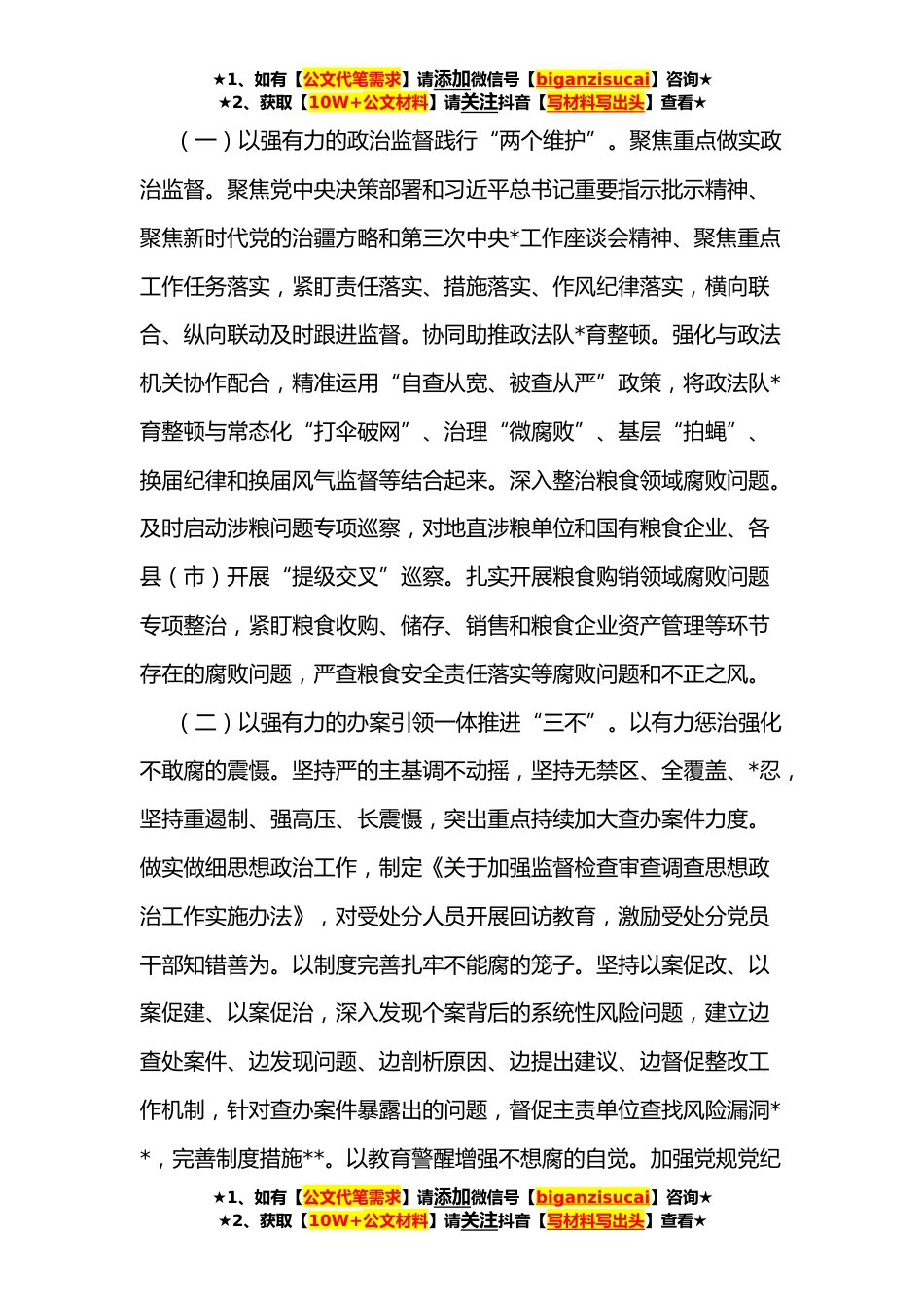 ★1、如有【公文代笔需求】请添加微信号【biganzisucai】咨询★★2、获取【10W+公文材料】请关注抖音【写材料写出头】查看★在**年地区党风廉政建设和反腐败工作会议上的讲话地委对召开这次地区党风廉政建设和反腐败工作会议高度重视,会前地委委员会议深入学习十九届中央纪委六次全会、特别是习近平总书记重要讲话精神,认真学习自治区纪委十届二次全会精神,专题听取地区纪委工作汇报,研究部署**年党风廉政建设和反腐败工作。刚才,地委xxx书记的讲话紧紧围绕全面贯彻习近平总书记重要讲话精神和十九届中央纪委六次全会、自治区纪委十届二次全会精神,充分肯定了**地区党风廉政建设和反腐败工作取得的成效,深刻分析依然严峻复杂的形势,明确提出当前和今后一个时期工作总体要求和主要任务,彰显了地委坚持全面...