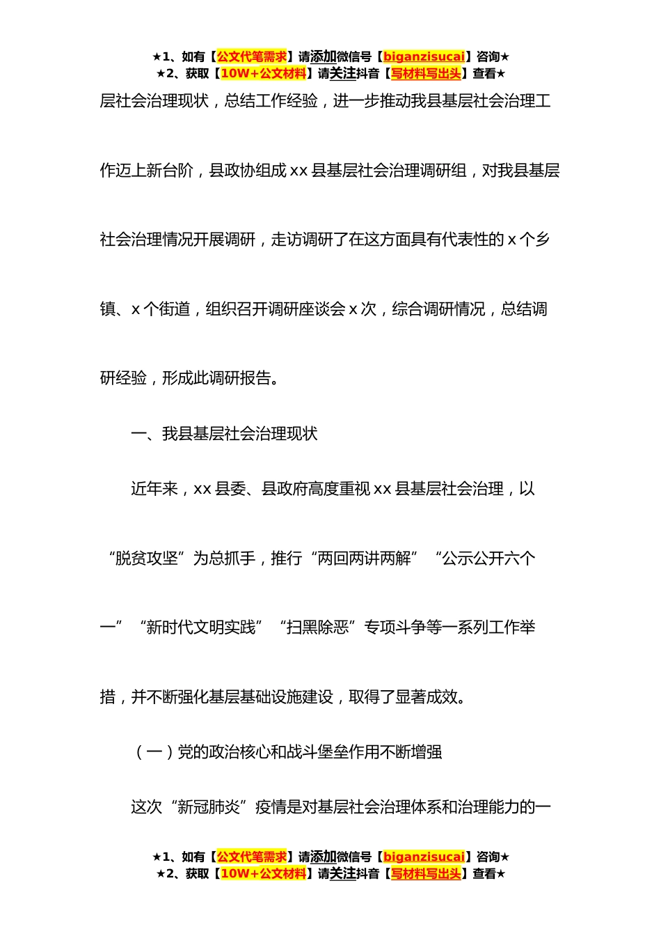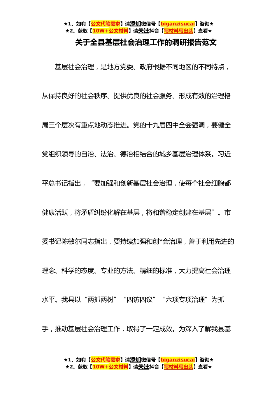 ★1、如有【公文代笔需求】请添加微信号【biganzisucai】咨询★★2、获取【10W+公文材料】请关注抖音【写材料写出头】查看★关于全县基层社会治理工作的调研报告范文基层社会治理,是地方党委、政府根据不同地区的不同特点,从保持良好的社会秩序、提供优良的社会服务、形成有效的治理格局三个层次有重点地动态推进。党的十九届四中全会强调,要健全党组织领导的自治、法治、德治相结合的城乡基层治理体系。习近平总书记指出,“要加强和创新基层社会治理,使每个社会细胞都健康活跃,将矛盾纠纷化解在基层,将和谐稳定创建在基层”。市委书记陈敏尔同志指出,要持续加强和创*会治理,善于利用先进的理念、科学的态度、专业的方法、精细的标准,大力提高社会治理水平。我县以“两抓两树”“四访四议”“六项专项治...